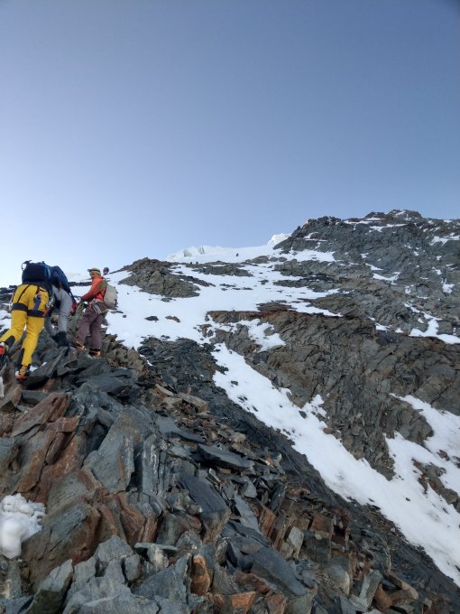 Hie und da treten die ersten blanken Stellen auf und am letzten Aufschwung vor der Gabel hat es eine vereiste Passage von rund 20m Metern, wo 2 bis 3 Eisschrauben fast zwingend sind. Ab dem Festijoch führt eine Spur direkt durch die Firnhänge. Besser oder sicherer ist es jedoch, wenn man ab dem ersten Turm (ca. 50m oberhalb des Jochs) in die Felsen ausweicht und dort solange wie möglich hochsteigt.