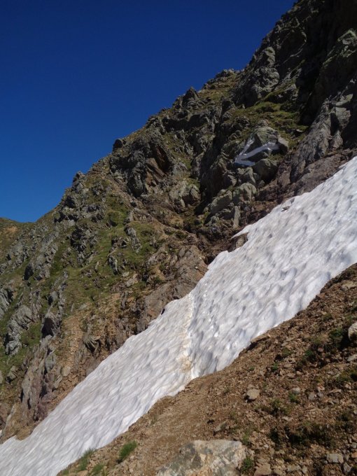 Nach kalter Nacht vom Montag auf Dienstag (Übernachtung in der Bristenseehütte) war das kurze Schneefeld beim Einstieg (weisser Pfeil) auf den NE-Grat gefroren und daher heikel. Mit Pickel und Seilsicherung ging es gut. Ansonsten Grat schneefrei, an schattigen Stellen ein wenig Schneereif von der kalten Nacht.