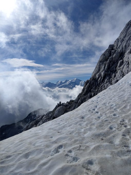 Sehr gute Verhältnisse, Abstieg über Cheminées de Sallanches gewählt (ohne Steigeisen und Pickel).