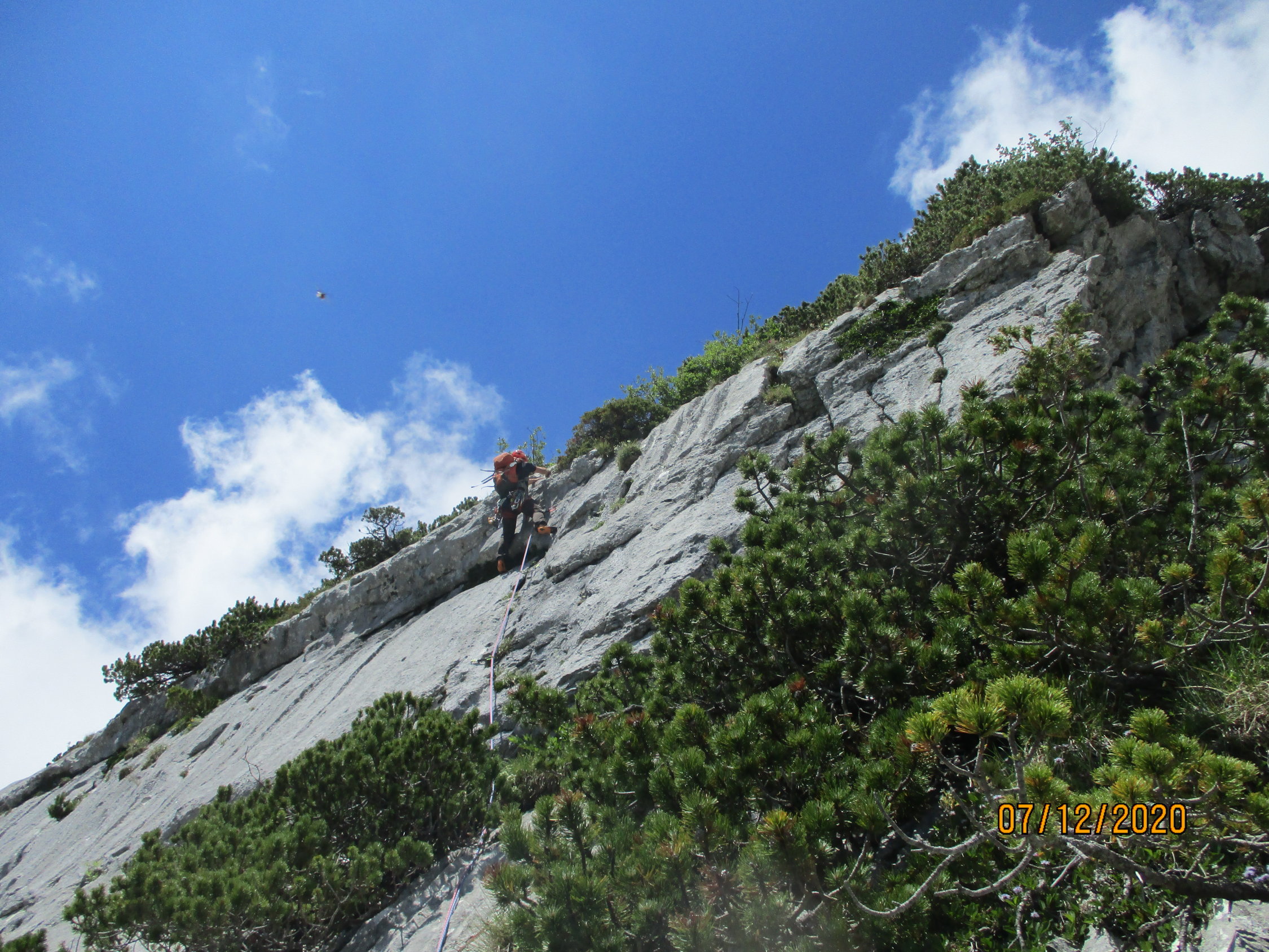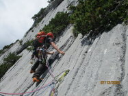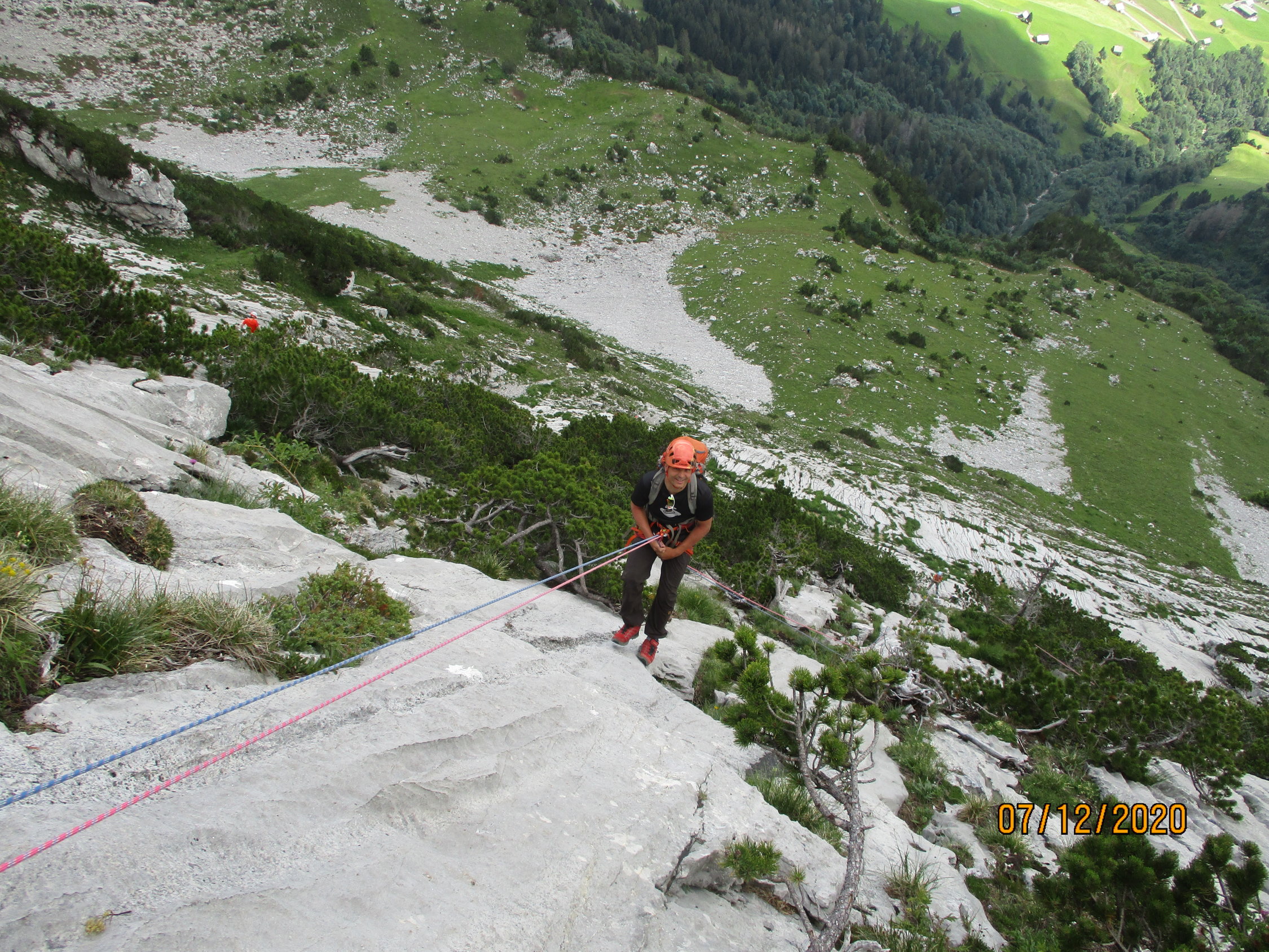 Da wir die Topos zuhause vergessen hatten, können wir im nachhinein nicht mehr so genau sagen, was wir geklettert haben. Wohl irgendwo zwischen Gimmi und der Gelben, insgesamt kamen wir auf 6 SL. Da der Fußabstieg auf Anhieb nicht ersichtlich war - wiederum die vergessenen Topos :-( - entschlossen wir uns zur Rückkehr über die Abseilpiste. Ging gut, 3x mit 60 m Doppelseil.