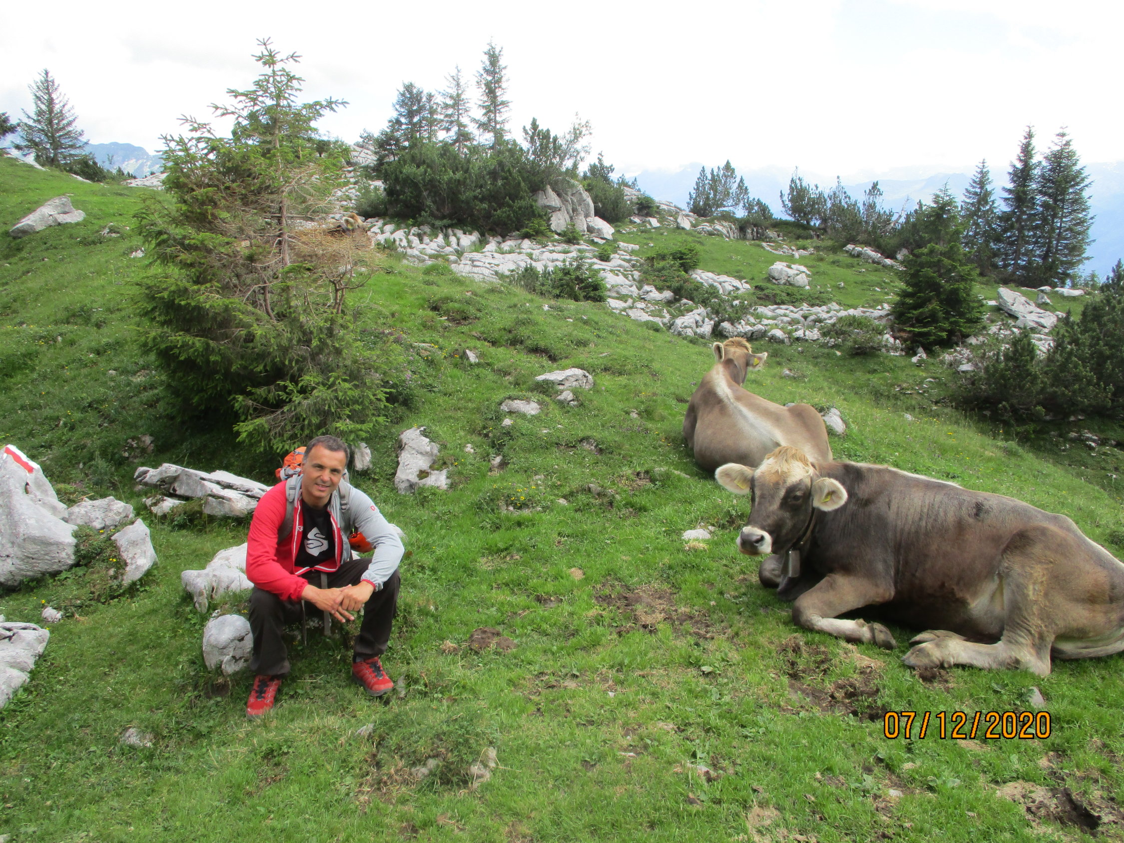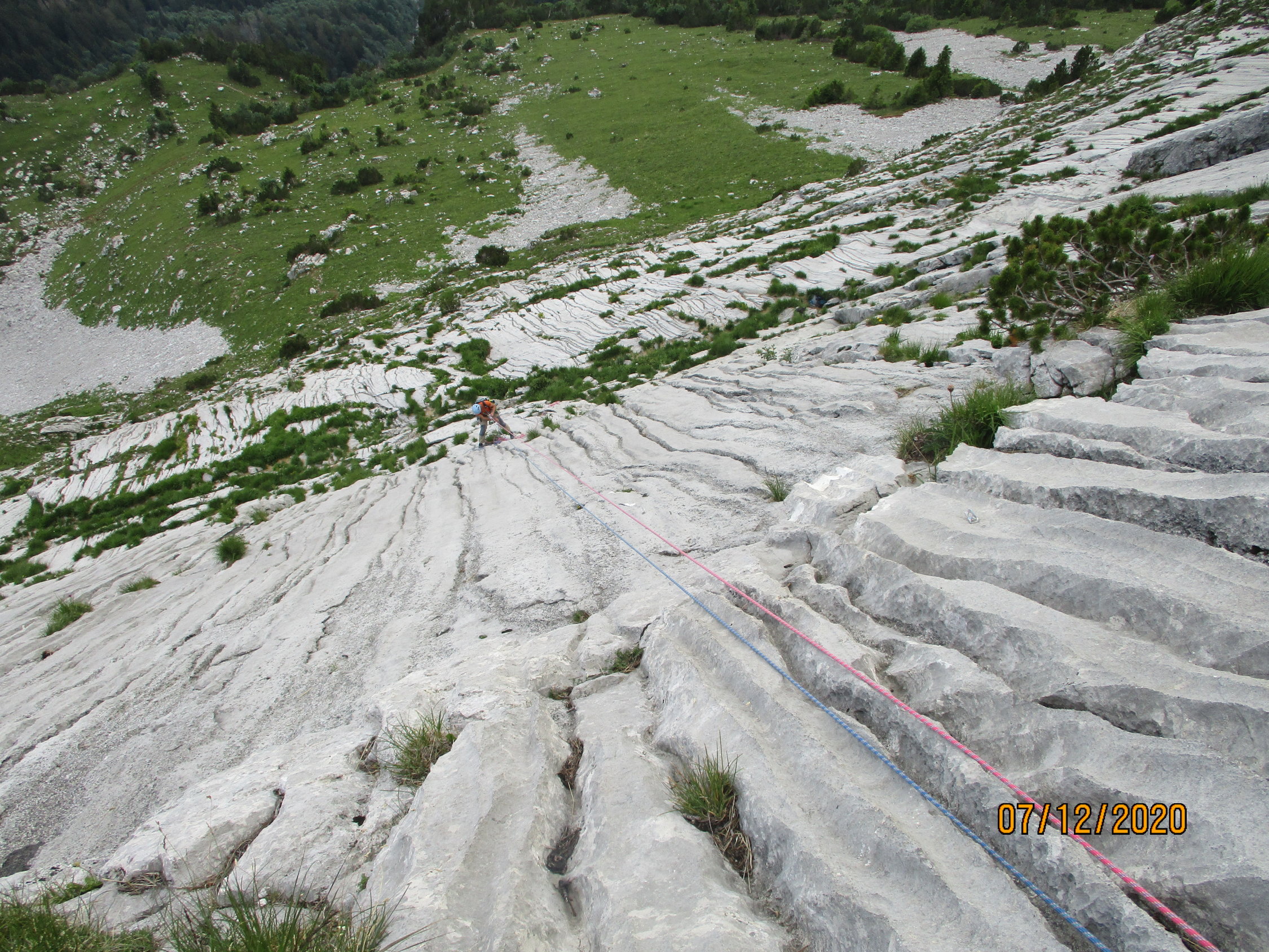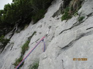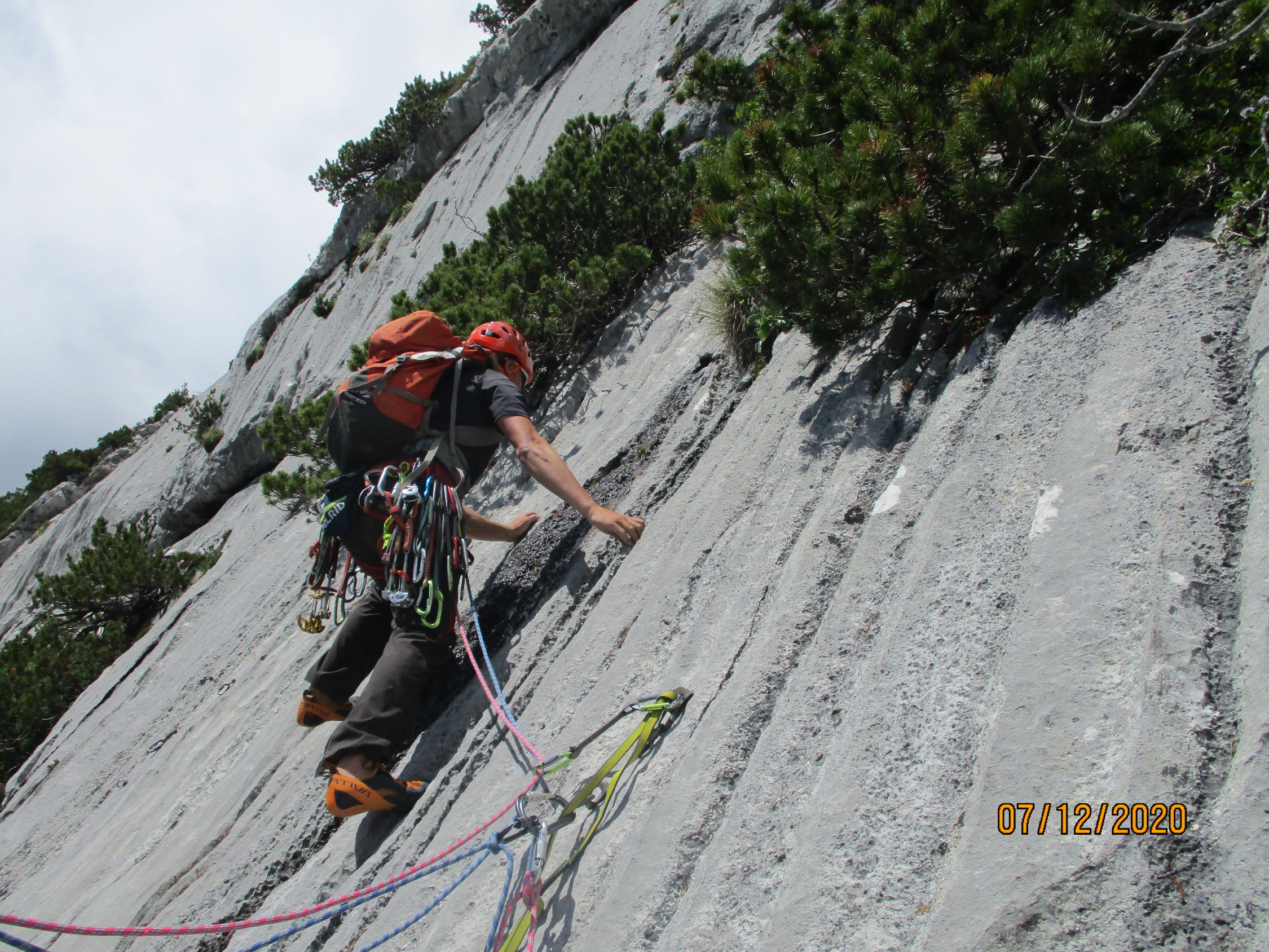 Nach den gestrigen Niederschlägen fanden sich zwar noch nasse Schlieren in der Wand, diese wurden aber beim Klettern nicht berührt. Mit Bewölkung gemäßigte Temperaturen. Nicht zu viele Seilschaften unterwegs, in der gesamten Südostwandplatte waren es wohl 4 oder 5 Seilschaften, ohne uns.