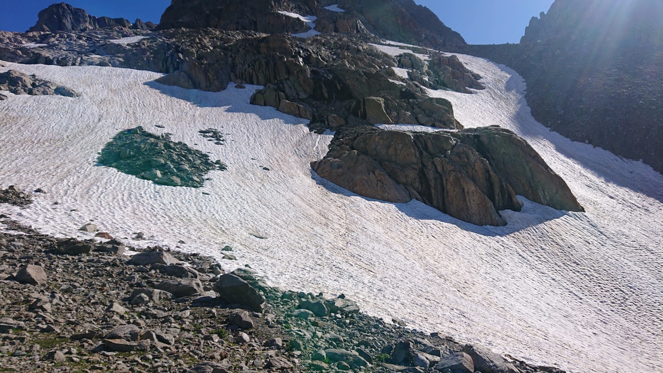 Auf ganzen Route keine Spalten gesehen (ausser kurz vor Gipfel - weiter wegen neben der Route).
