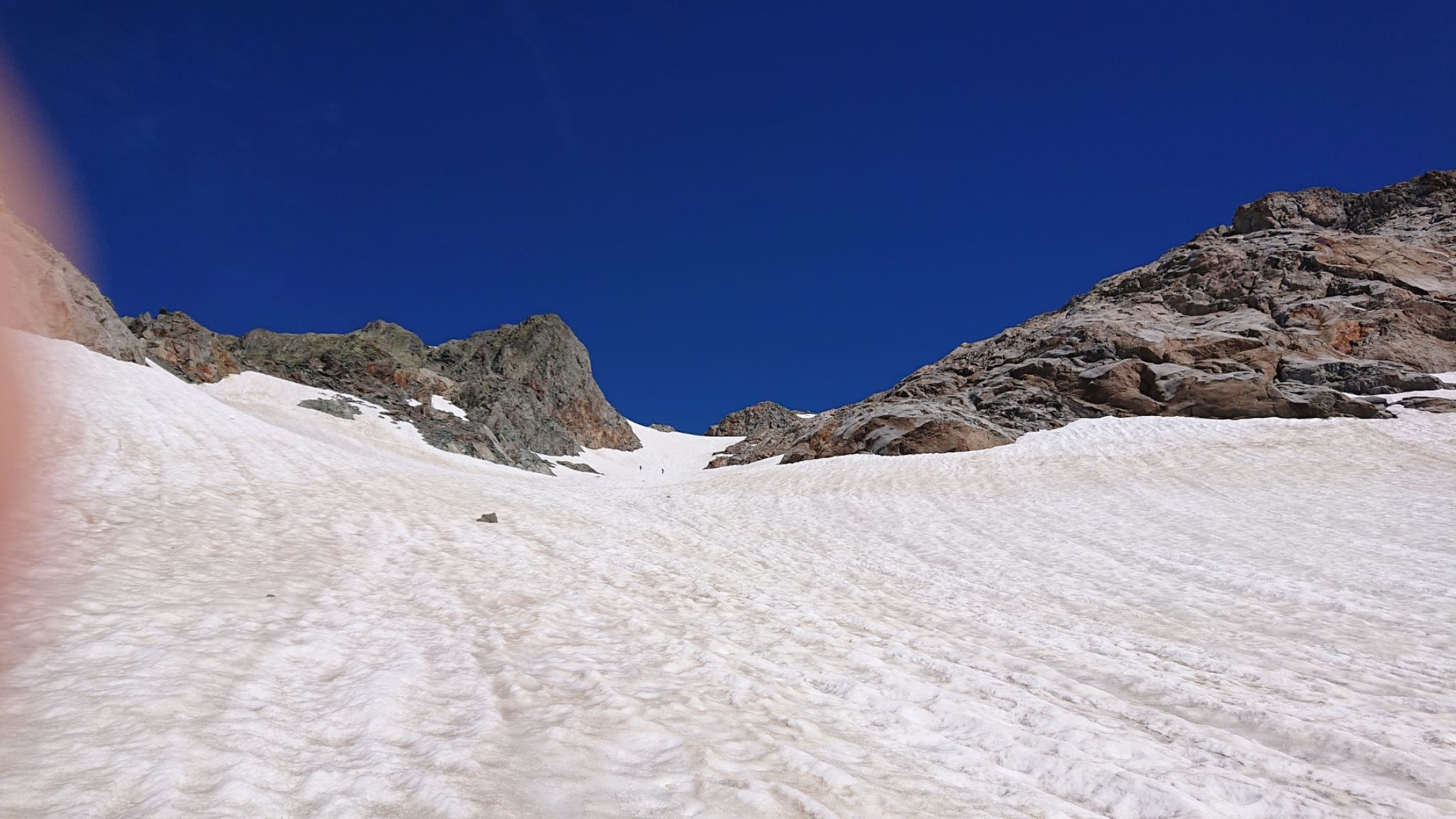 Dort Steigeisen und Seil angezogen und Richtung steiles "Coulouir / Engstelle). Alles problemlos zu Fuss zum Sattel hoch im Zickzack.
