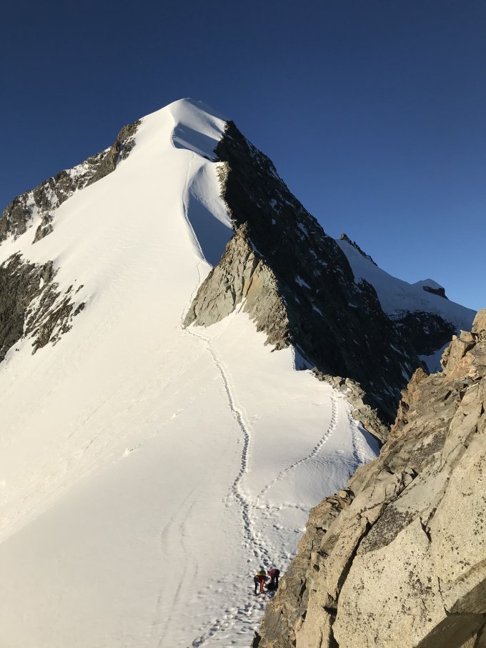 Biancograt hat perfekte Verhältnisse, harter Schnee über den gesamten Grat (Steigeisen zwingend nötig). Die Temperaturen waren nach der Kaltfront morgens noch bei ca. -5°C, daher noch nichts aufgefirnt.