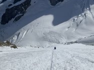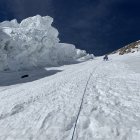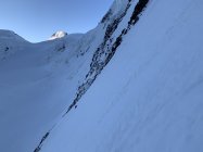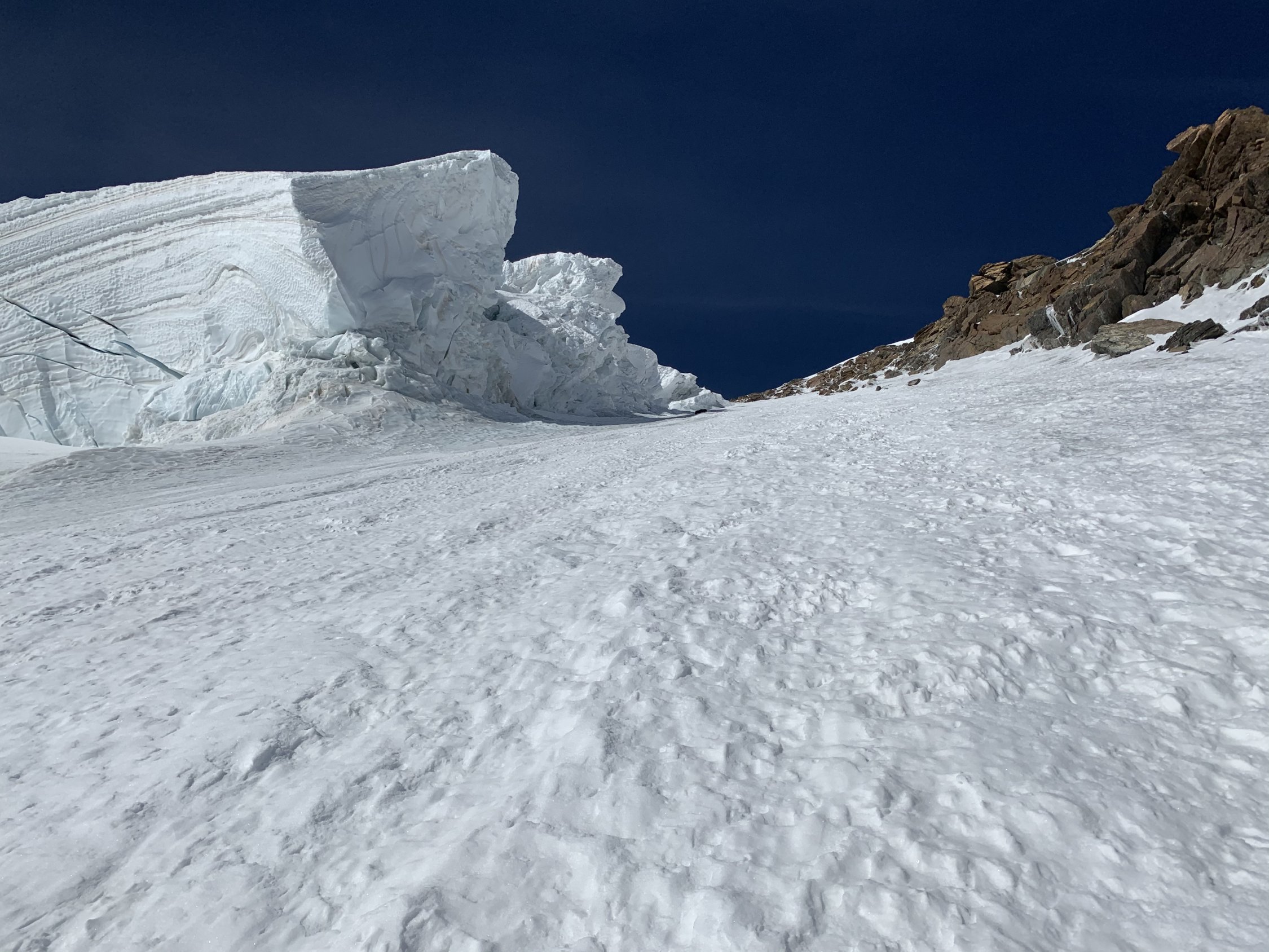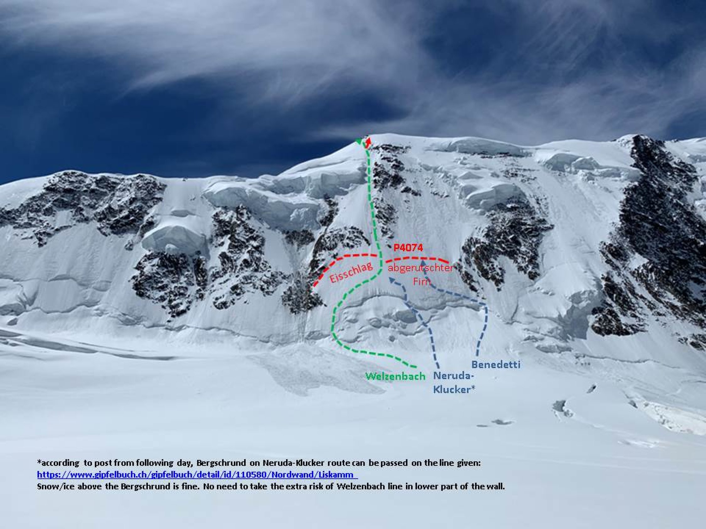 Bergschrund an Stelle des Einstiegs Klucker /Benedetti erschien nicht passierbar. Teile des darüberliegenden Wandabschnitts sind auf ca. 200 Höhenmetern in den letzten Tagen abgerutscht. Nach Rückmeldung einer Folgeseilschaft am nächsten Tag ist der Bergschrund auf der Neruda-Klucker Route an einer Stelle leicht passierbar und die Firnauflage im darüber liegenden Wandteil griffig. Ein Einstieg weiter rechts des Bergschrunds mit Querung zurück in die Routen Klucker / Benetti wäre evtl auch möglich. Wir sind ganz links am Bergschrund vorbei, dabei ist man für ca. 30 min einem - möglicherweise unnötigen - Eisschlagrisiko ausgesetzt, dessen man sich bewusst sein muss. Wir nahmen am Einstieg keinerlei Eisschlagaktivität war, den auf dem Bild erkennbaren grossen Abgang noch weiter links sahen wir erst von oben aus der Wand. Dieser ist frisch, da auf Bildern der Vorwoche nicht vorhanden.