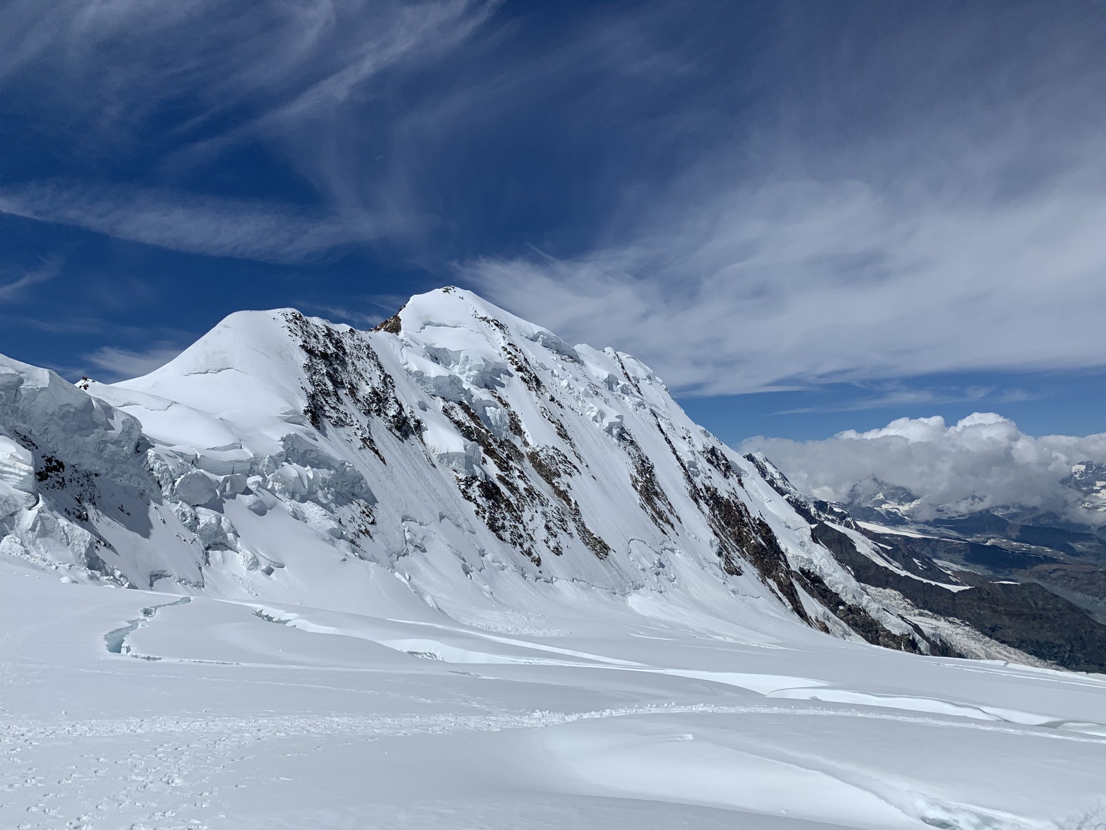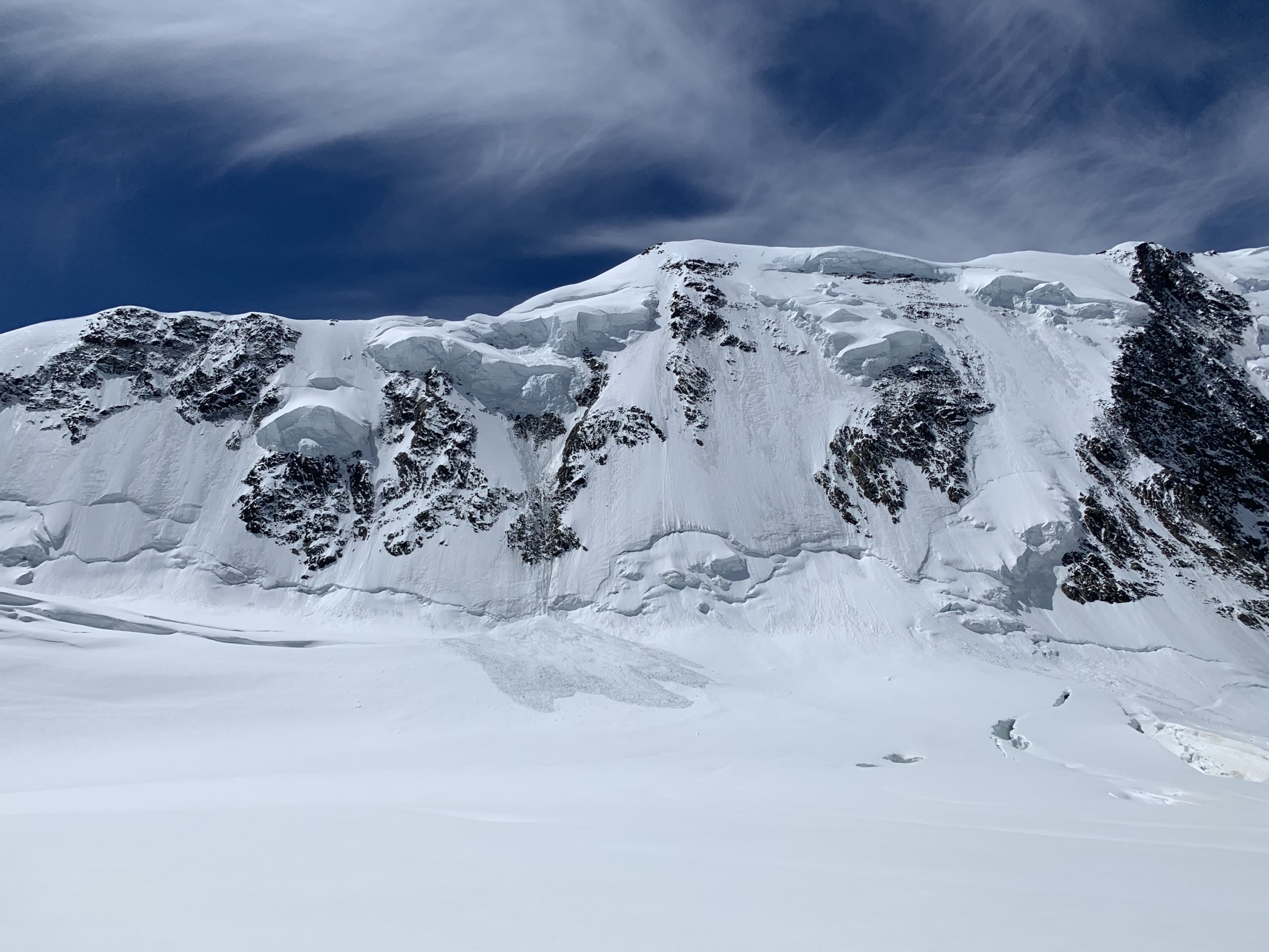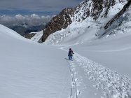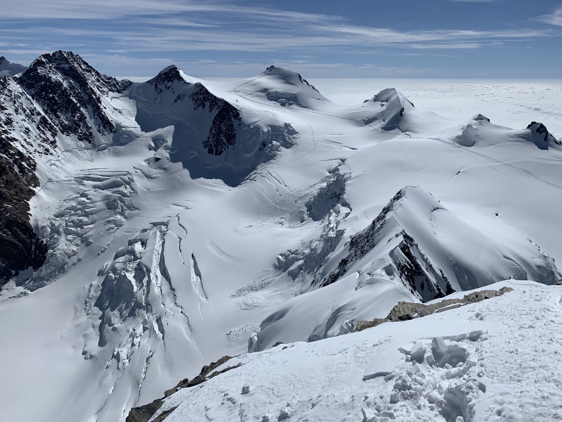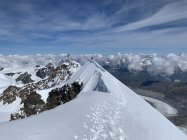 Ostgipfel um 10 Uhr erreicht. Abstieg vom Ostgipfel auf sehr guter Spur, von der italienischen Seite hat es deutlich mehr Neuschnee. Abstieg über Grenzgletscher zur Monte Rosa Hütte auf guter Spur.