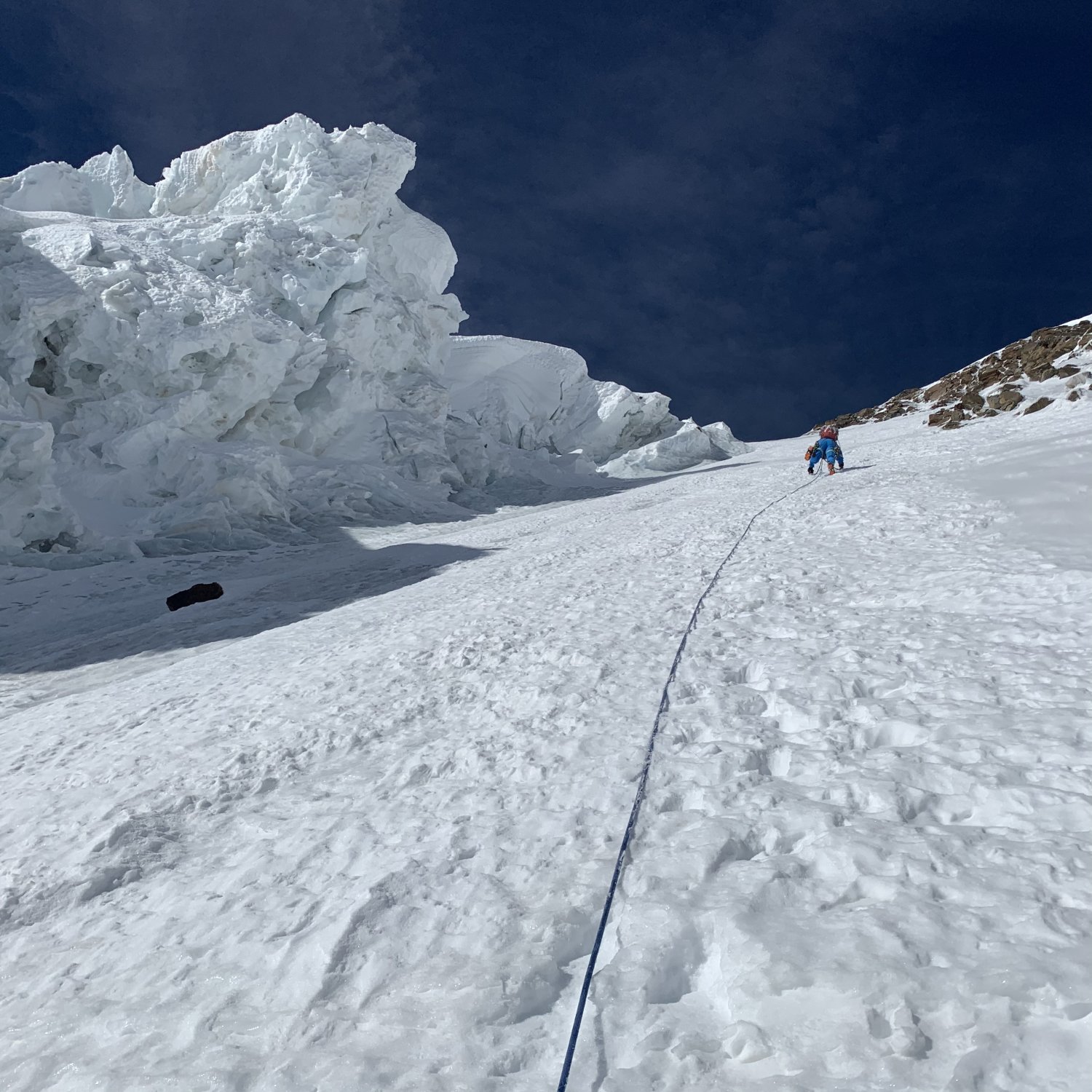 Ergänzende Bemerkung: Am Folgetag wurde die Linie von Kadö wiederholt - nach Rückmeldung dieser Seilschaft kann der Bergschrund wohl Mitte rechts einfach überwunden werden. Diese Variante ist in Bezug auf Eisschlaggefahr wesentlich sicherer als die von uns gewählte originale Welzenbach-Führe. Uns war vor Ort dieser Durchschlupf nicht ersichtlich.
