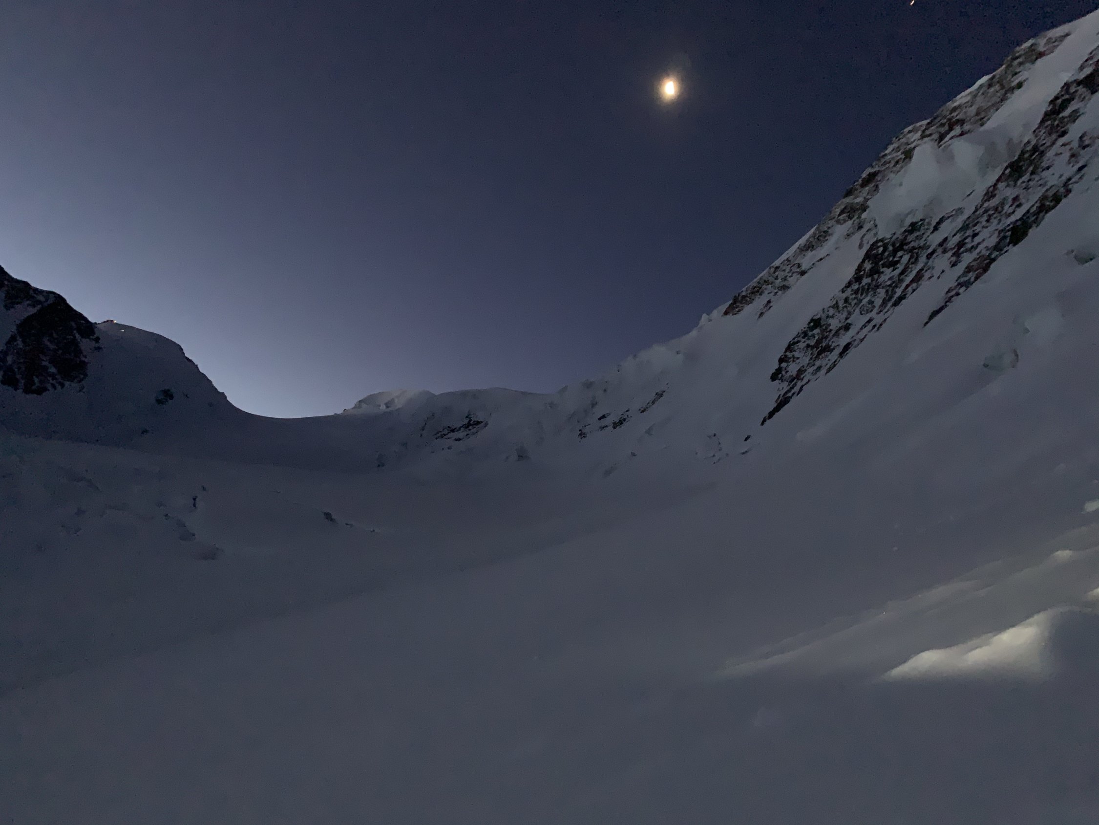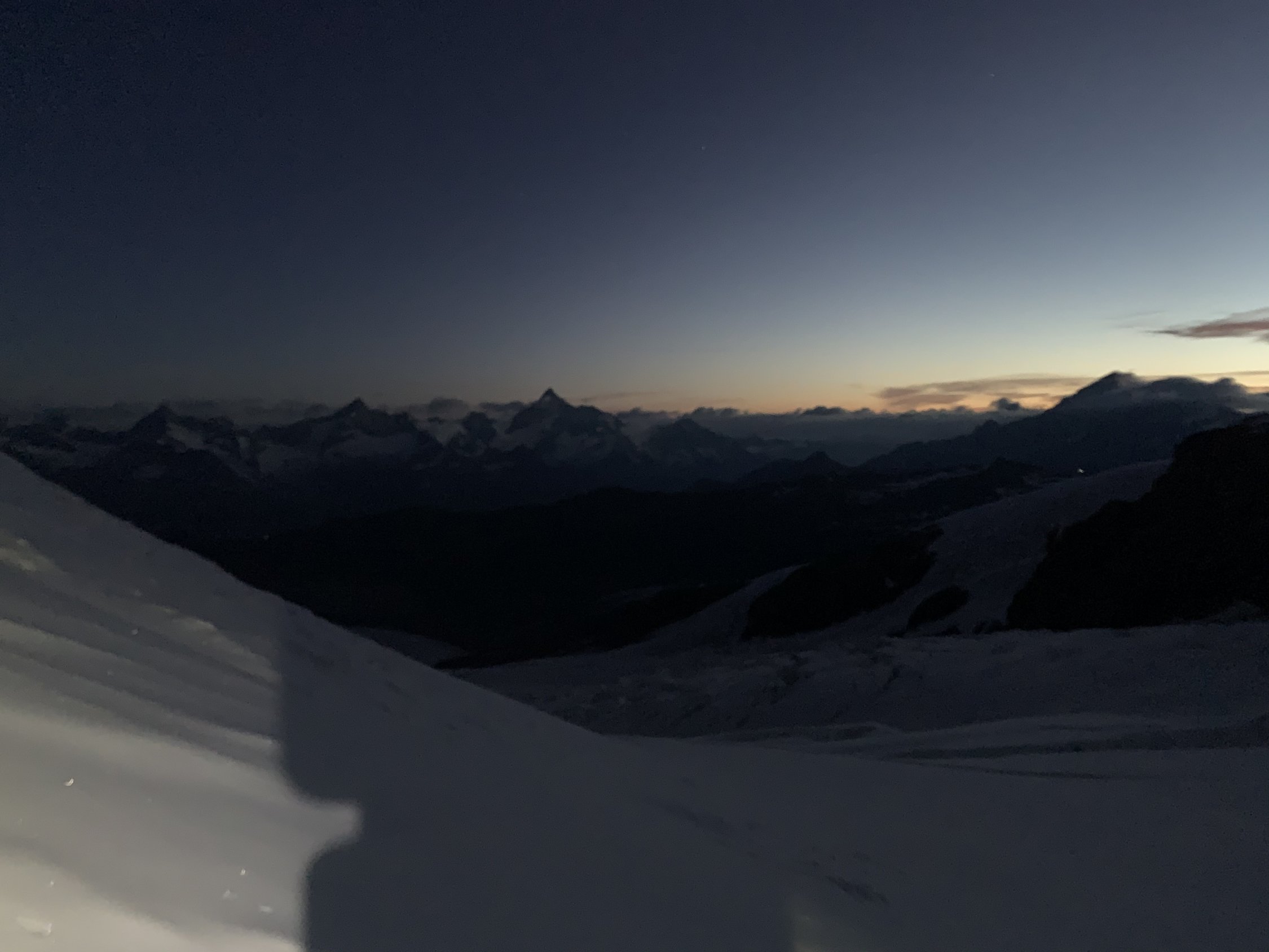 Start Hütte 2:20. Grenzgletscher tragend gefroren, ab 3400 wenig gefrorene Schneeauflage vom Niederschlagsereignis vom Freitag.