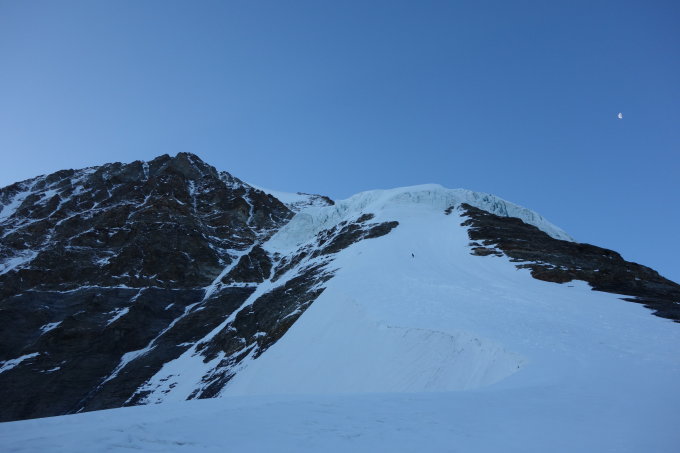 Start um 4 Uhr von der Guggihütte. Im ersten Felssaufschwung zuerts kurzer Abstieg entlang der Wasserleitung, dann überraschend guter Weg ähnlich Hüttenzustieg bis aufs erste Plateau, Weg ist sehr gut mit Steinmännern markiert. 2.Felsaufschwung zum Nollen einfach aber sehr brüchig, Achtung Steinschlag! Am Weg zum Nollen 5 cm griffige Firnauflage, haben 50hm unterm Felsriegel gesichert. Sind den Nollen im Schneecouloir links mit 10cm Trittschnee einfach umgangen (siehe Bild). Am Nollen insgesamt 2 mal 50m Standplatzsicherung, dann auf tragendem Firn einfach bis zur Gipfelflanke.