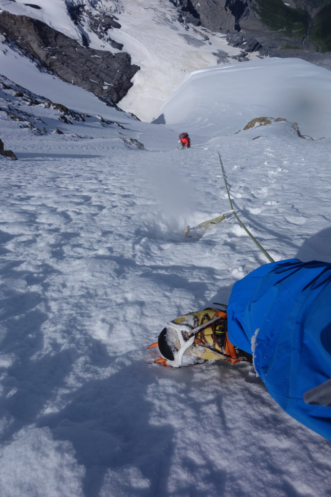 Bergschrund kann derzeit an verschiedenen Stellen einfach überwunden werden, wir haben uns links gehalten zu den Felsen(siehe Bild). Dort durchwegs bis oben 5 cm griffige Firnauflage und alle 10-15m eine Schraube gesetzt. Dank Firnauflage kann man das Wadentraining immmer wieder einfach pausieren.