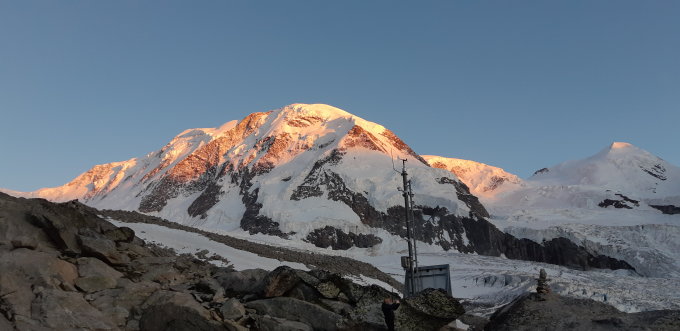 Gletscher nach wie vor sehr gut gangbar und Schneedecke bis zu Mittag perfekt tragend. Grat trocken mit Trittschneepassagen. Abstieg zum Silbersattel mittels Abseilen. Danach hat es eine gute Spur, wenngleich auch derzeit direkt unterhalb der größten Seracs vom Nordend. Steilste Stelle muss beim Abstieg mittels Sprung überwunden werden. Neuer Hüttenweg zur Monte Rosa landschaftlich eindrucksvoll aber langatmig. Gletscherbruch am Anfang apert langsam aus und Spalten öffnen sich aber noch leicht zu überwinden.