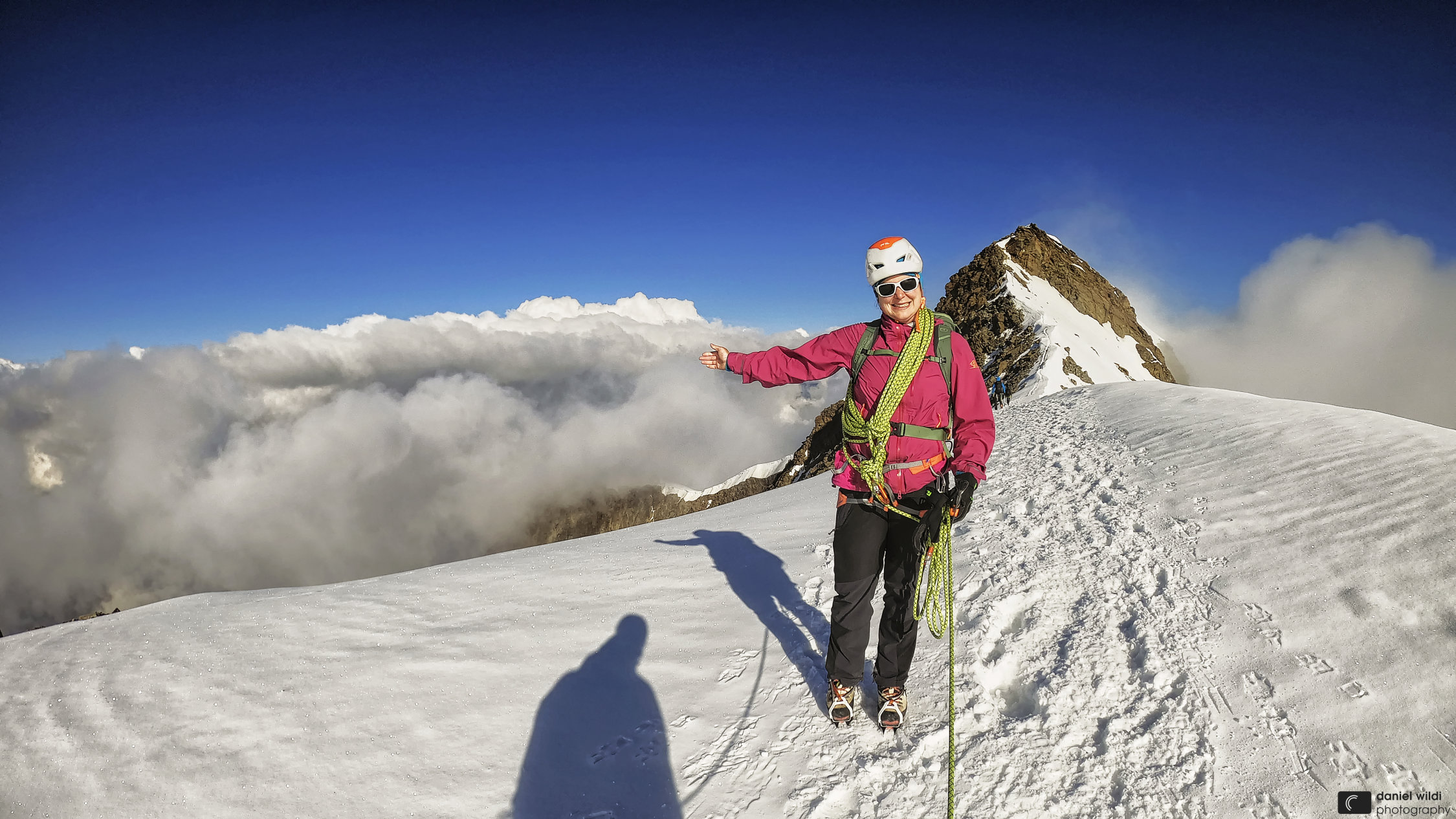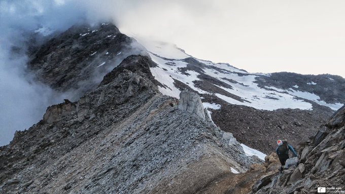 Aufstieg auf Zwischbergenpass ohne Steigeisen. Schneefelder östlich vom Grat perfekt, Fels schneefrei/trocken, Grat zwischen Vor- und Hauptgipfel tiptop.