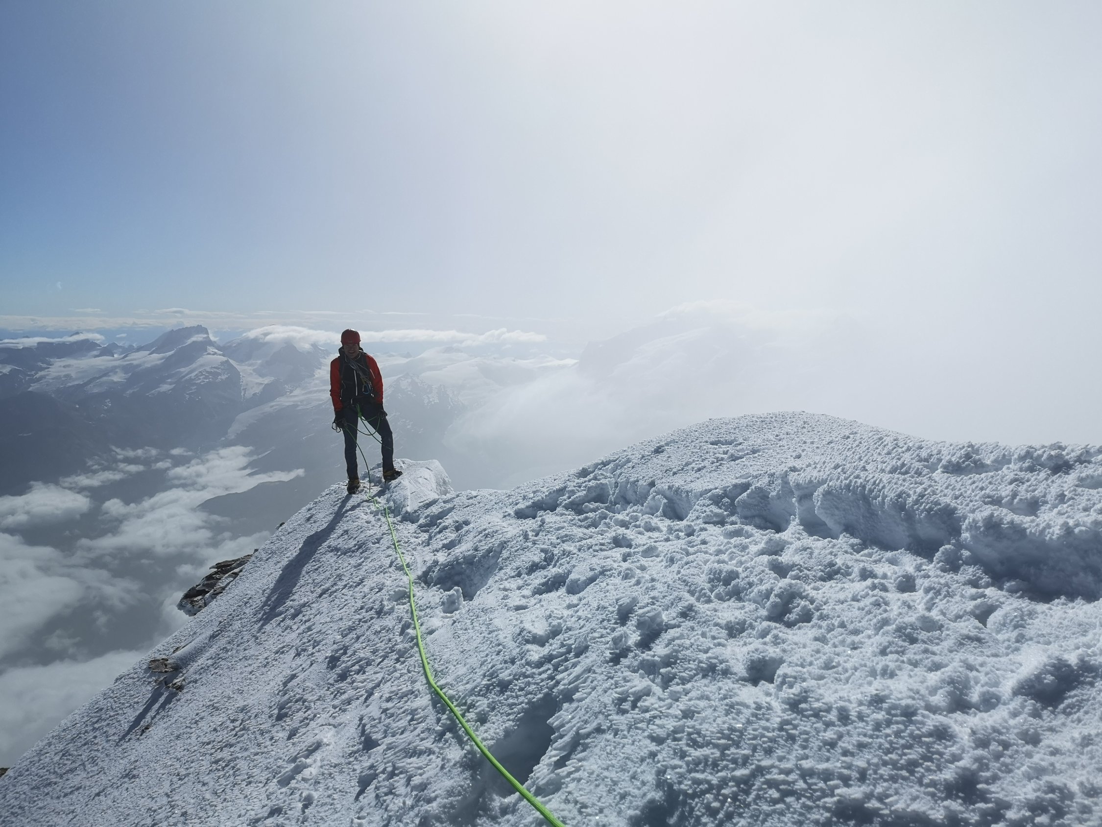 mit 3 Bergführern und deren 3 Kunden um 3:50 Uhr von der Hörnlihütte los, bis Solvay im Windschatten der Bergführer, dann alleine weiter, die Bergführer drehten mit den Kunden um, oben Sturm und Vereisung