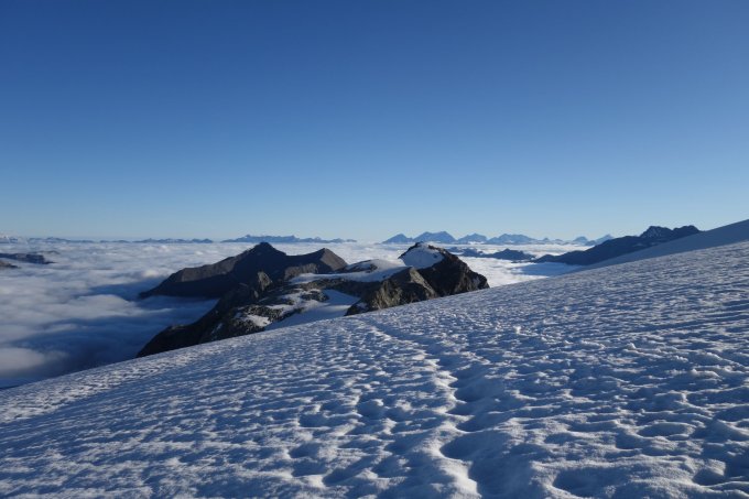 Gletscher angenehme zu gehen, Firndreick: gute wenn auch dünne Firnauflage, Grat schneefrei ohne Steigeisen geklettert, Abstieg über den Gletscher in angenehm weichem Schnee, kaum eingesunken, kaum Eiskontakt.