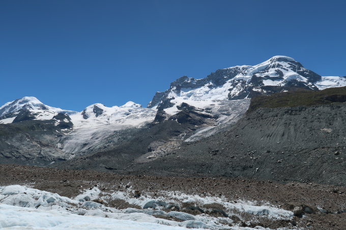 Zustieg zum Biwakplatz ab Furi über den Gornergletscher. Gletscher von Vorteil auf dessen nördlicher Seite (wo er weiss und nicht schuttbedeckt ist) begehen und erst auf Höhe des Biwakplatzes nach Süden abschwenken.