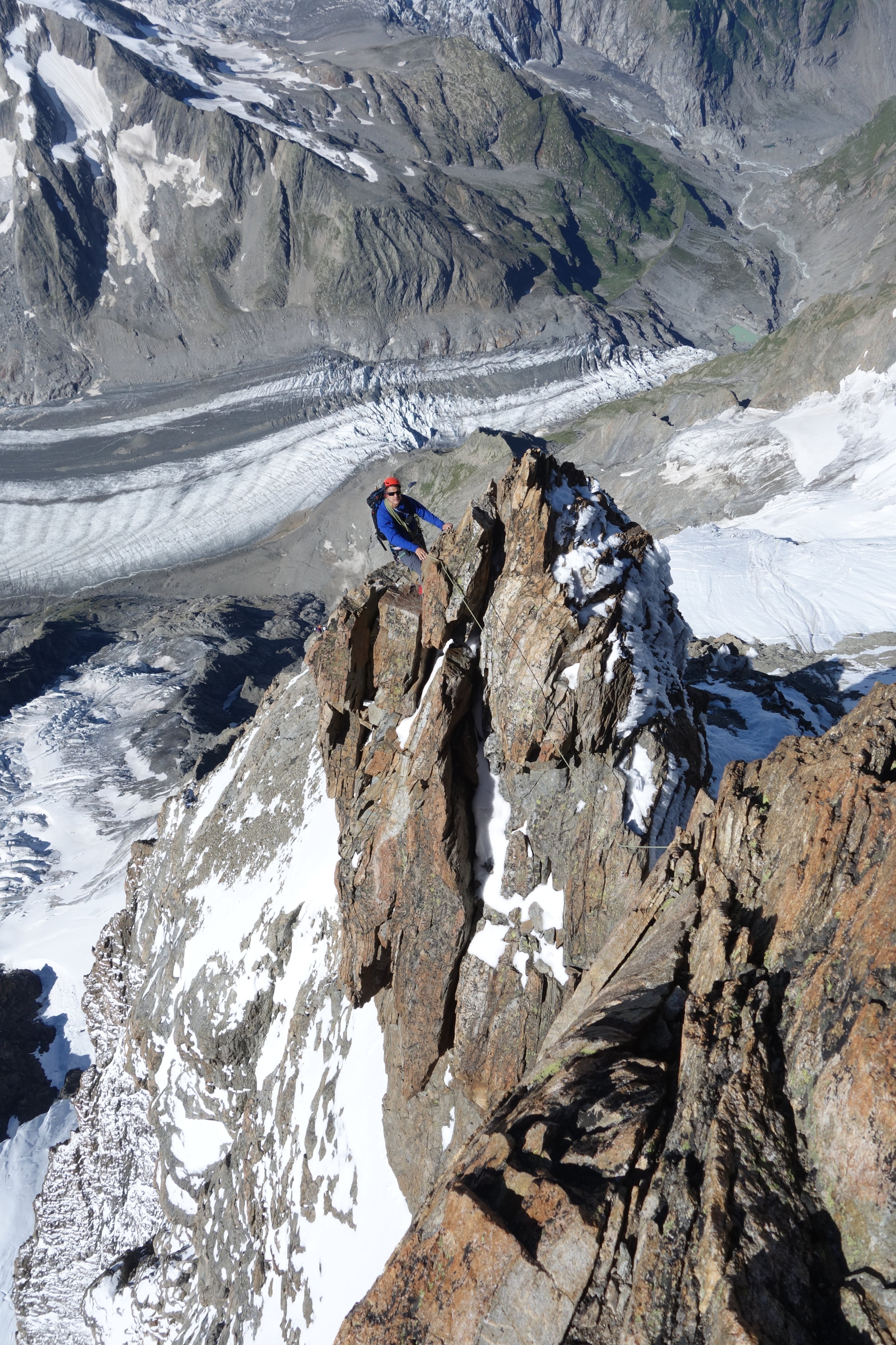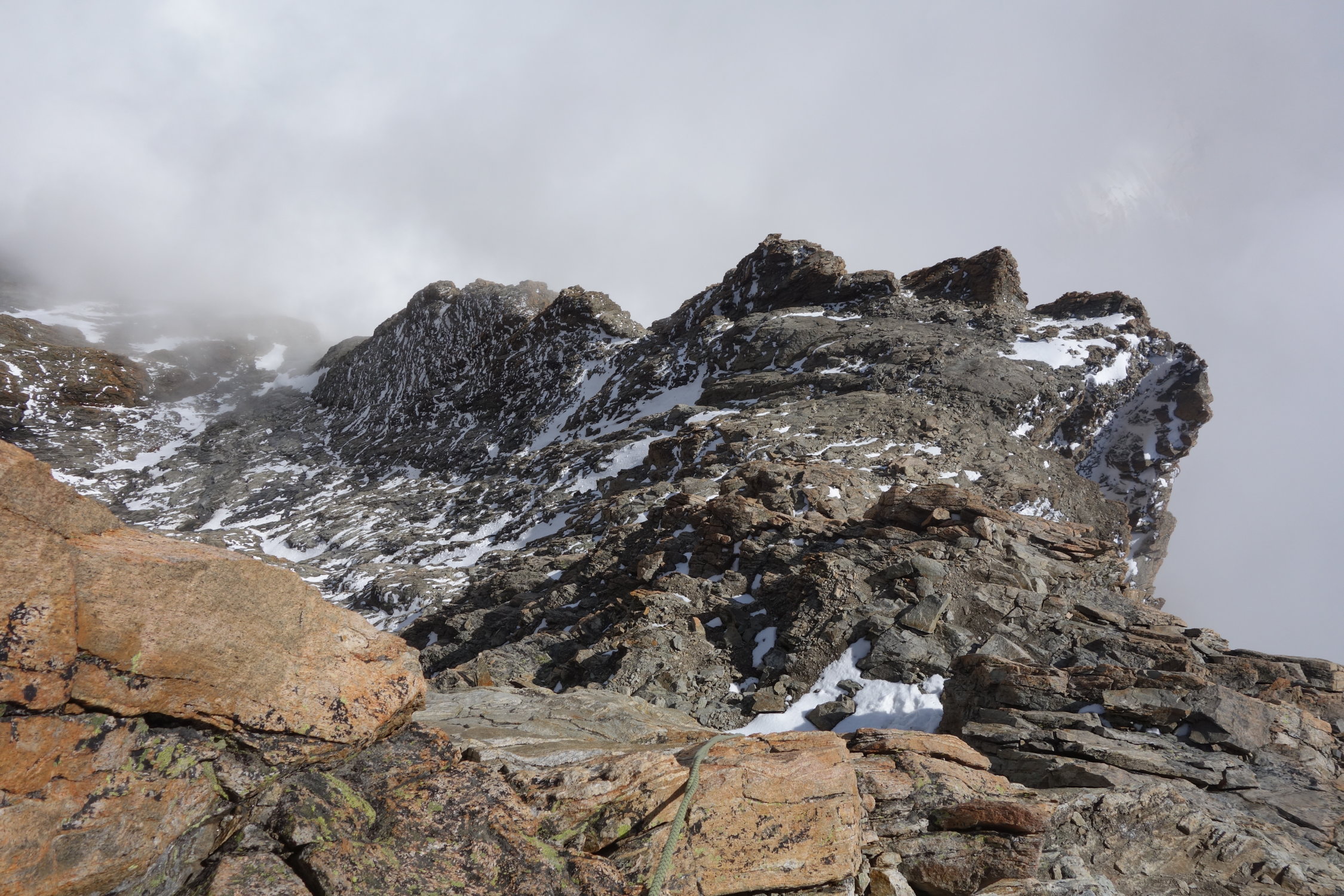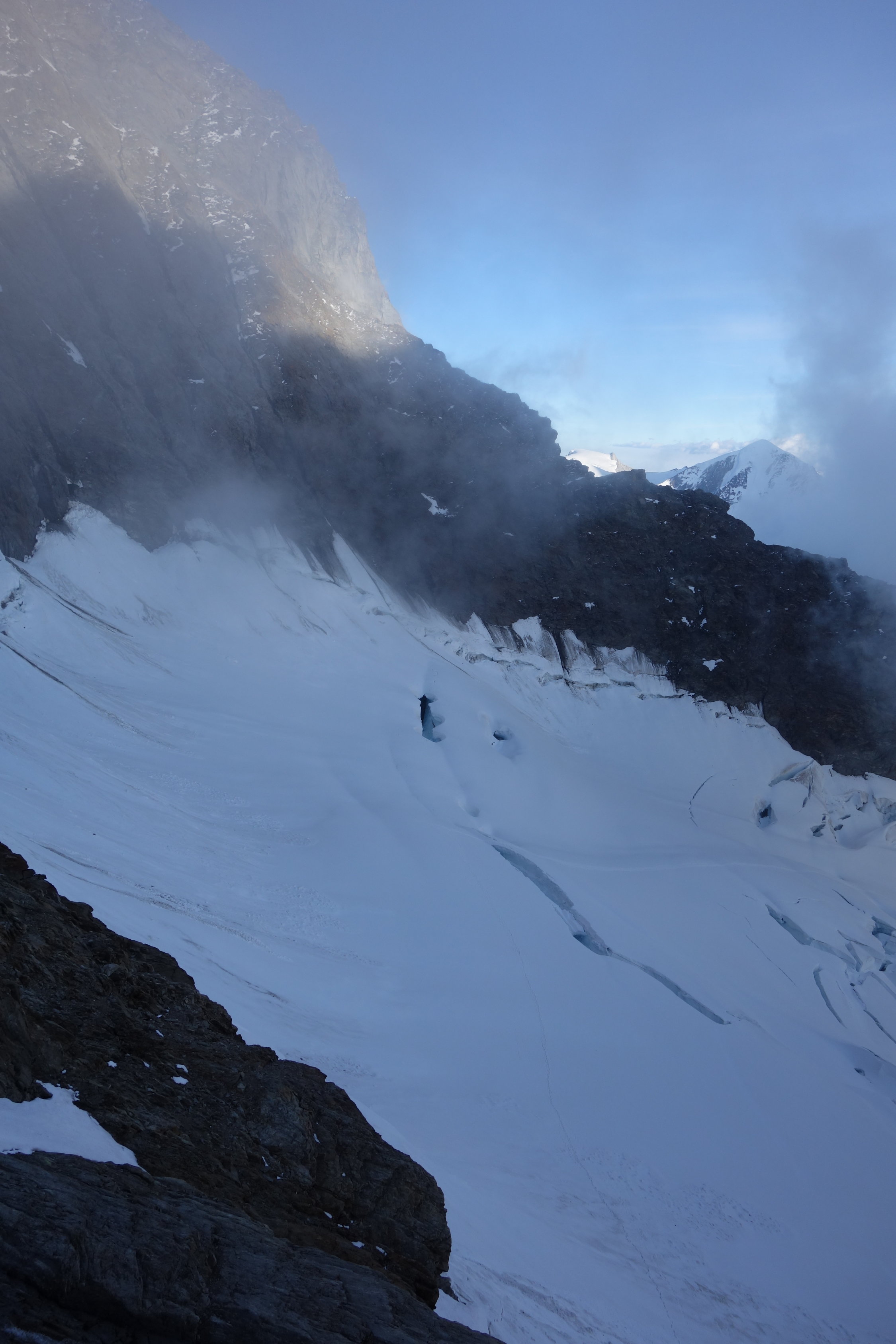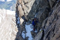 Start um 3:00 von der Schreckhornhütte. Am Einstieg um ca. 6:00, den Bergschrund kann man noch sehr gut von der Seite überwinden. Am Schreckfirn muss man mehrere grosse Spalten passieren, die Brücken sind so weit aber noch solide, im Abstieg etwas heikel da der Schnee sehr weich wird. Felsteil trocken und schneefrei trotz der Niederschläge der vergangenen Tage, sind daher ab dem Einstieg ohne Steigeisen geklettert, auf der Schulter um ca. 9:00, dann folgt eine schöne und zum Teil ausgesetzte Kletterei. In der letzten Seillänge vor dem Firnfeld hat es etwas Wassereis auf den Felsen (NW-exponiert), daher heikel, aber es hat einen Stand. Am Gipfel um ca. 13:00.