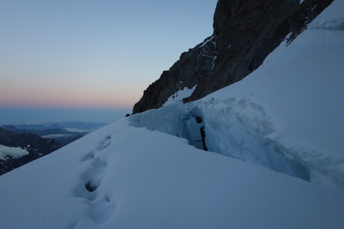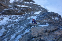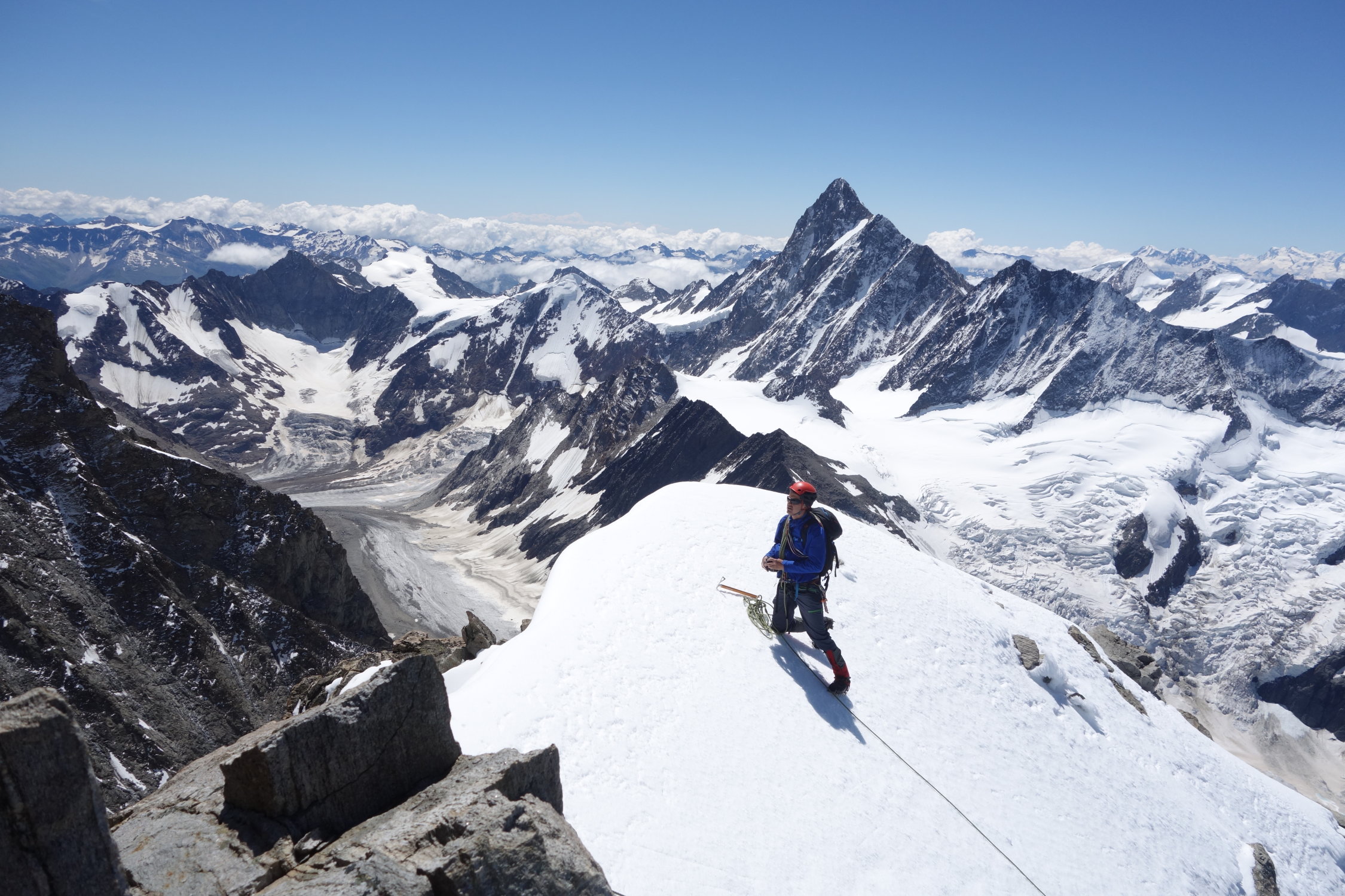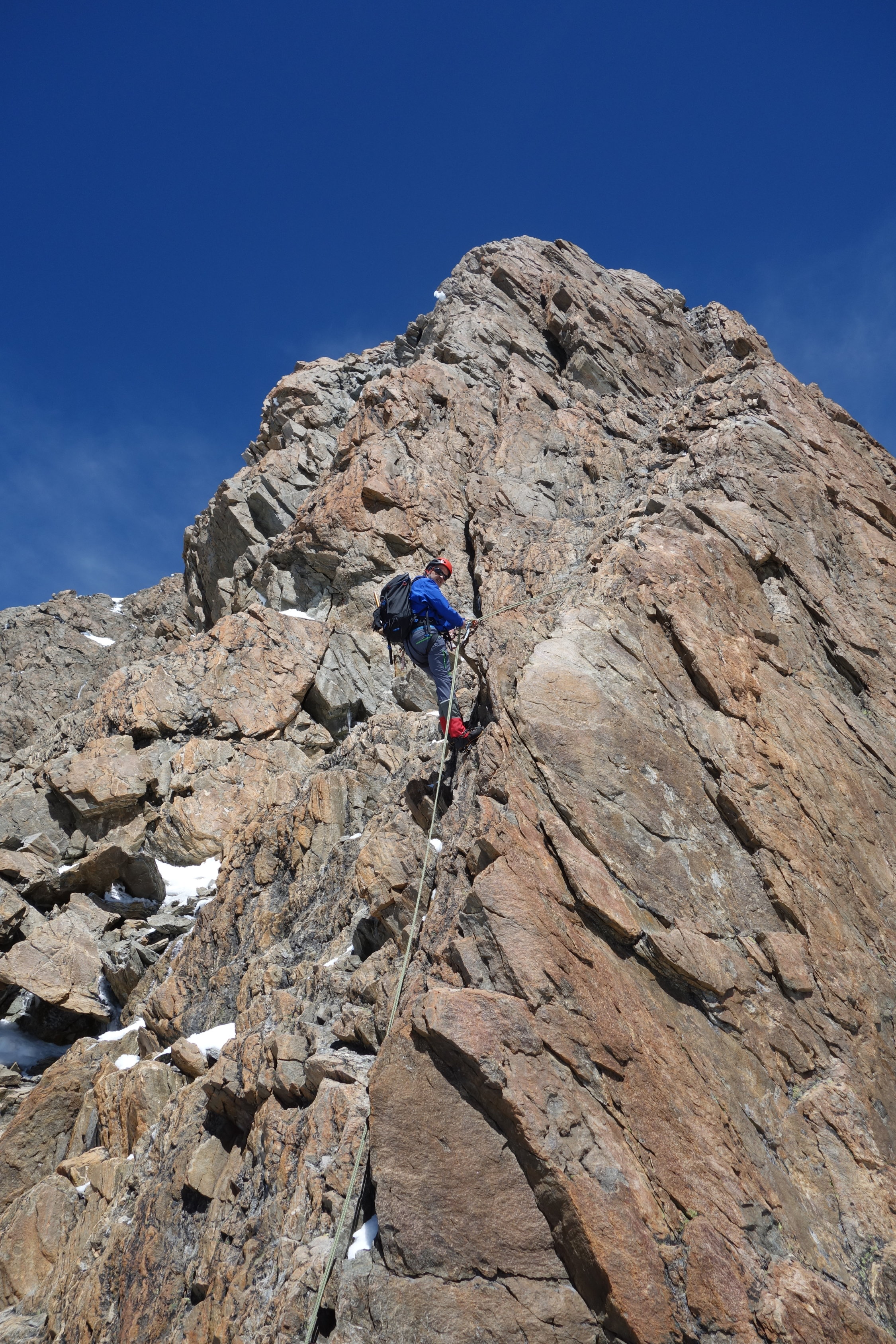 Start um 3:00 von der Schreckhornhütte. Am Einstieg um ca. 6:00, den Bergschrund kann man noch sehr gut von der Seite überwinden. Am Schreckfirn muss man mehrere grosse Spalten passieren, die Brücken sind so weit aber noch solide, im Abstieg etwas heikel da der Schnee sehr weich wird. Felsteil trocken und schneefrei trotz der Niederschläge der vergangenen Tage, sind daher ab dem Einstieg ohne Steigeisen geklettert, auf der Schulter um ca. 9:00, dann folgt eine schöne und zum Teil ausgesetzte Kletterei. In der letzten Seillänge vor dem Firnfeld hat es etwas Wassereis auf den Felsen (NW-exponiert), daher heikel, aber es hat einen Stand. Am Gipfel um ca. 13:00.
