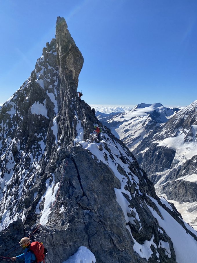sehr gute Verhältnisse auf dem Grat. Hart und griffiger Firn, kein Blankeis, und trockene Felsen. Auf dem Abstieg auf dem Normalweg gut eingeschneiter Gletscher. Der Abstieg vom Lombardi Biwak kann zurzeit ohne Abklettern/Abseilen im steilen Firn zum Bärenloch erfolgen.