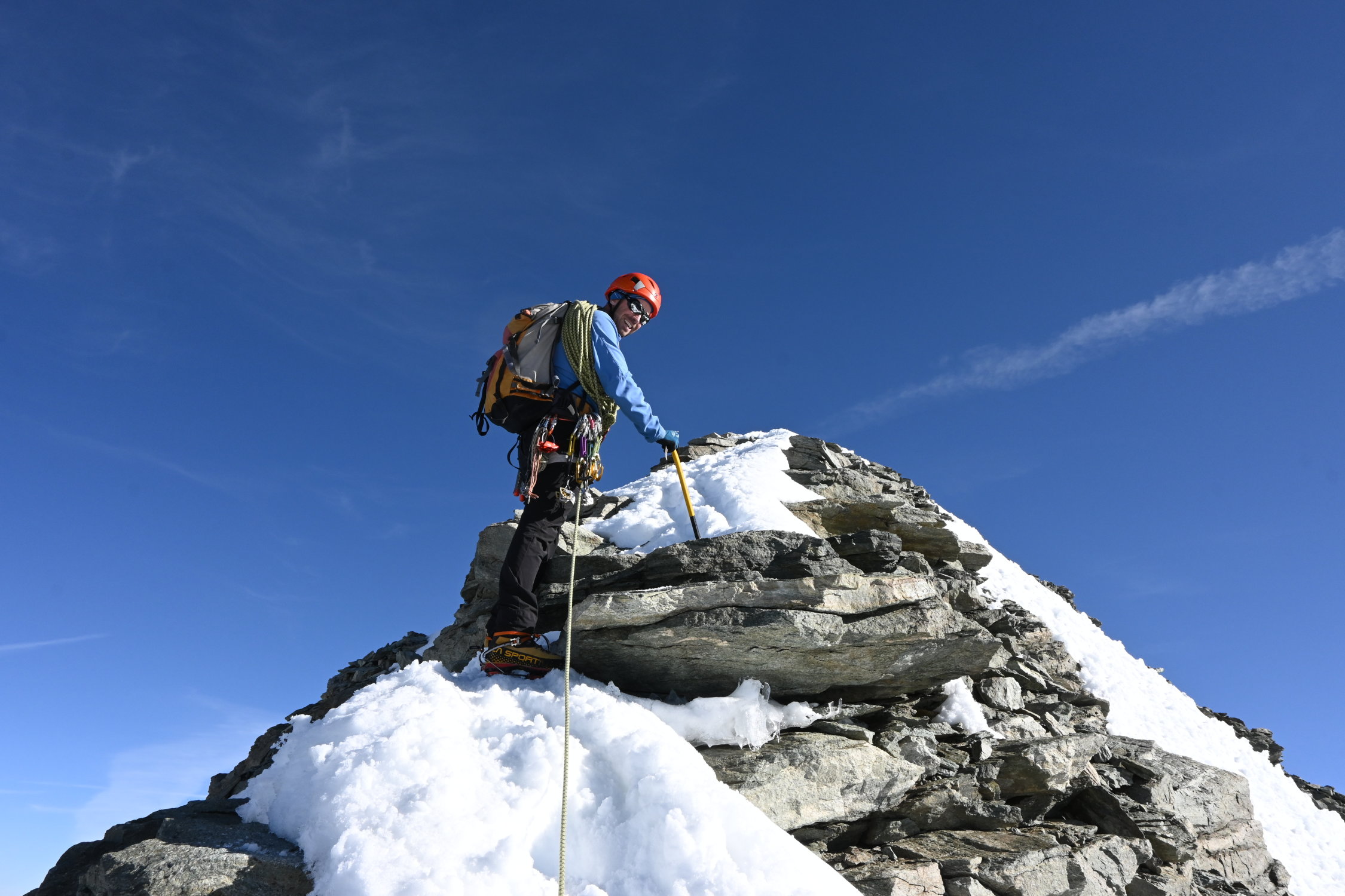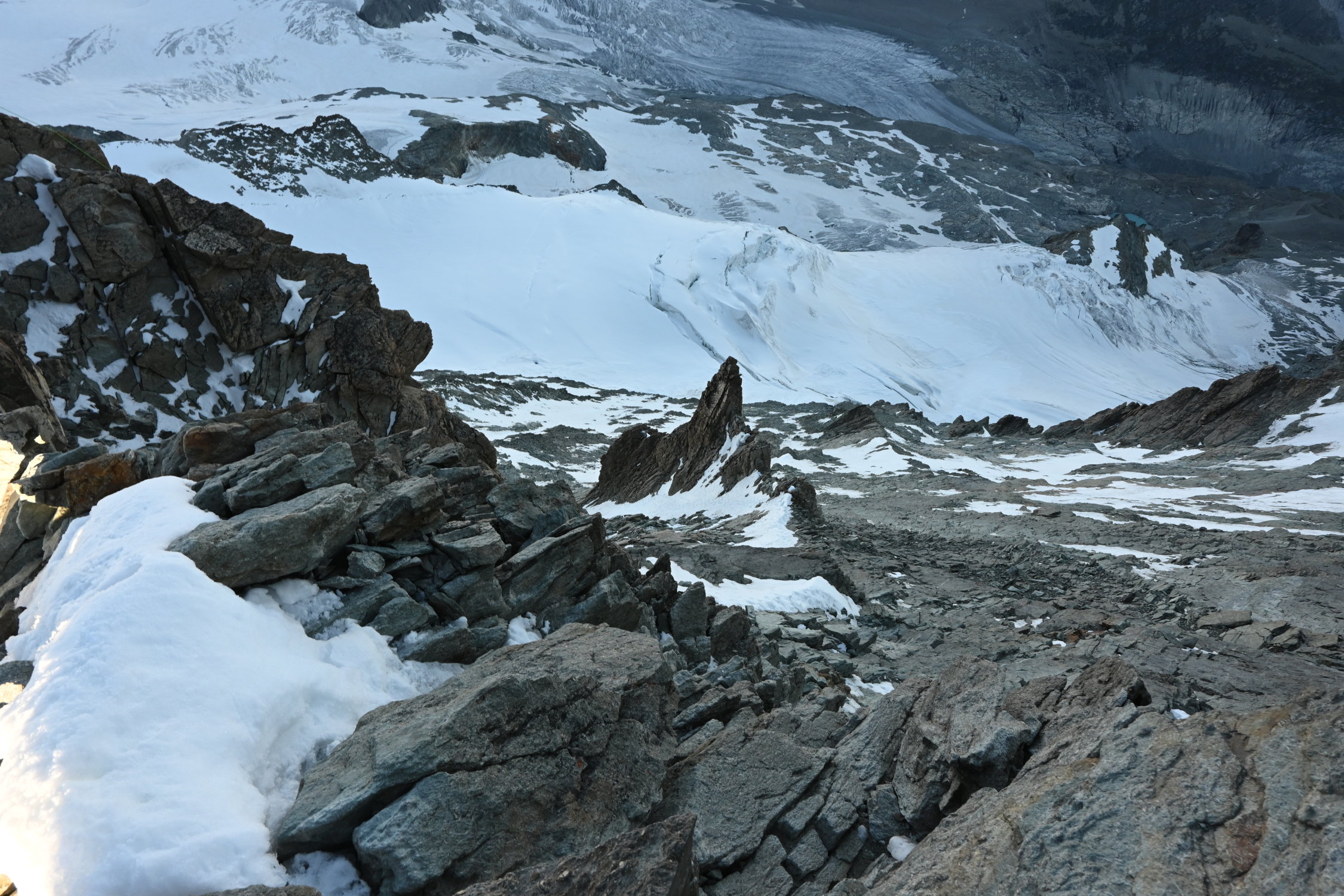 Derzeit sehr gute Verhältnisse: Fels grossteils trocken, Gletscher noch gut eingeschneit, am morgen Hartschnee. Umgehung des Gendarms im unteren Teil Trittschnee, obere Hälfte mehrheitlich trockener Fels. Schlussgrat ebenfalls guter Trittschnee.