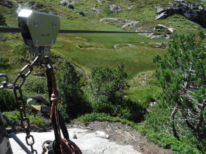 Tourenbeginn in Wilerli um 05:30 Uhr bei 14°C unter klarem Himme. Die gute alte Gondel funktioniert immer noch einwandfrei. Ohne Fahrplan. Rund um die Uhr. Aufstieg über den Stäibbi-Klettersteig am Faulbach-Wasserfall. Nach kurzer Stippvisite der Kröntenhütte, dann mittags noch auf den Krönten hinauf. KS-Utensilien deponierte ich zwischenzeitlich auf der Hütte. Über den Glatt Firn lief ich mit Steigeisen, um schneller zu sein (wäre auch ohne gegangen, nur rutschiger und langsamer) Im Aufstieg, wie auch Abstieg suchte ich die Firn- und Altschneefelder, welche guten Trittschnee boten, jedoch wegen der „Dellenoberfläche“ rutschig waren, so dass die Steigeisen im Abstieg schnelles Vorwärtskommen bescherten, ohne das Hosenboden und Rucksack nass wurde.