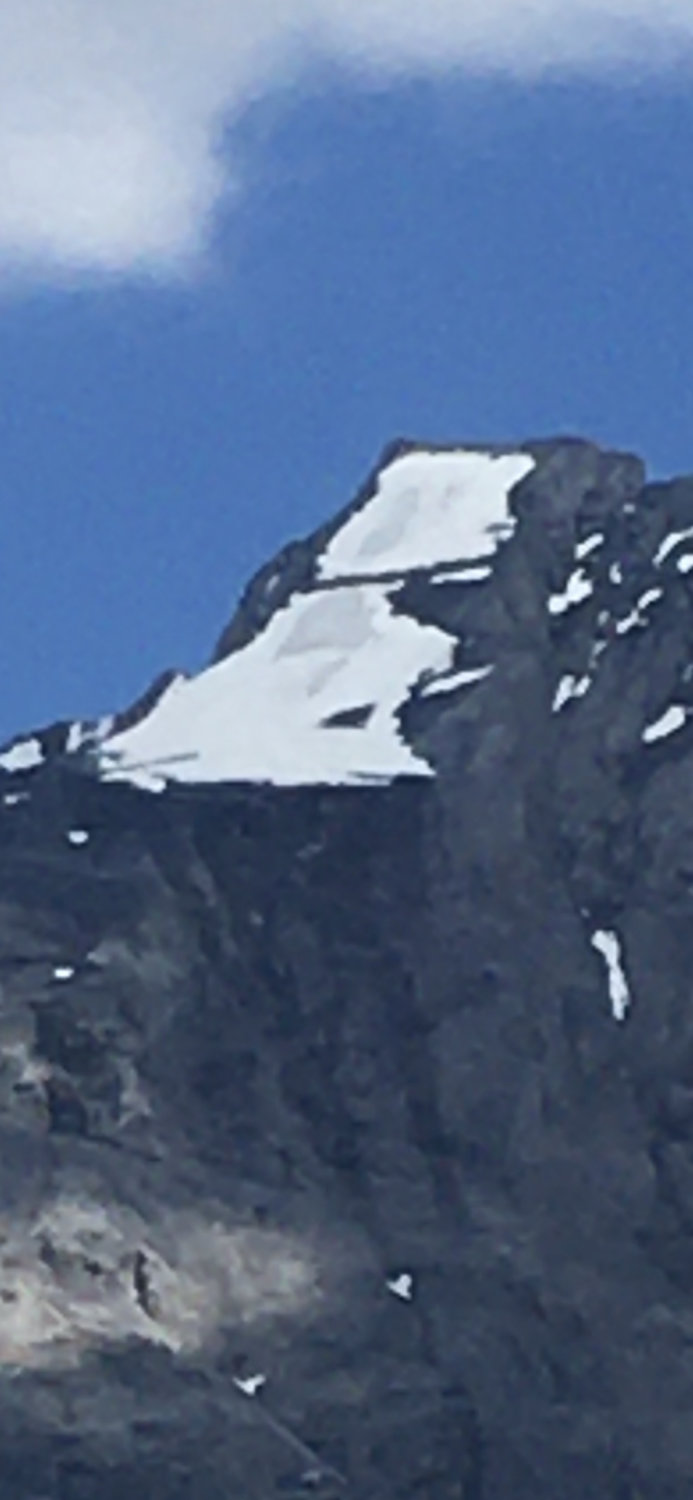 Gipfelfirnfeld ist im oberen Teil in seiner ganze Breite über etwa 8 m vollständig abgeschmolzen. Dieses Felsband kann erklettert werden, allerdings sind die obersten 2-3 m mit Wassereis überzogen (Eisschrauben für Stand oben und unten praktisch); wir haben das Felsband ganz links (im Sinne des Aufstiegs und ausgesetzter) umgangen.