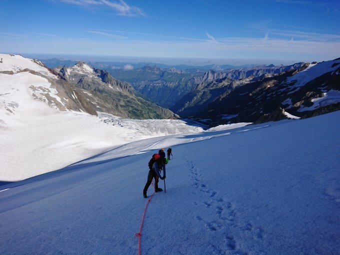 Der Gletscher ist zu Beginn noch aper, bald aber schneebedeckt. Spalten sind gut eingeschneit, oder können bei geeigneter Spuranlage gut umgangen werden (es war eine Spur vorhanden). Ab der obren Triftlimi hielten wir uns links, und bestiegen noch den Wysse Nollen. Von dort aus in einem weiten Bogen an Eggstock und Schneestock orientiert zum Dammastock. Die letzten Meter steiler Firn und sehr kurzer Grat zum Gipfel. Beginnt man früh genug am morgen hat man höchsten im Abstieg noch sulzigen Schnee.