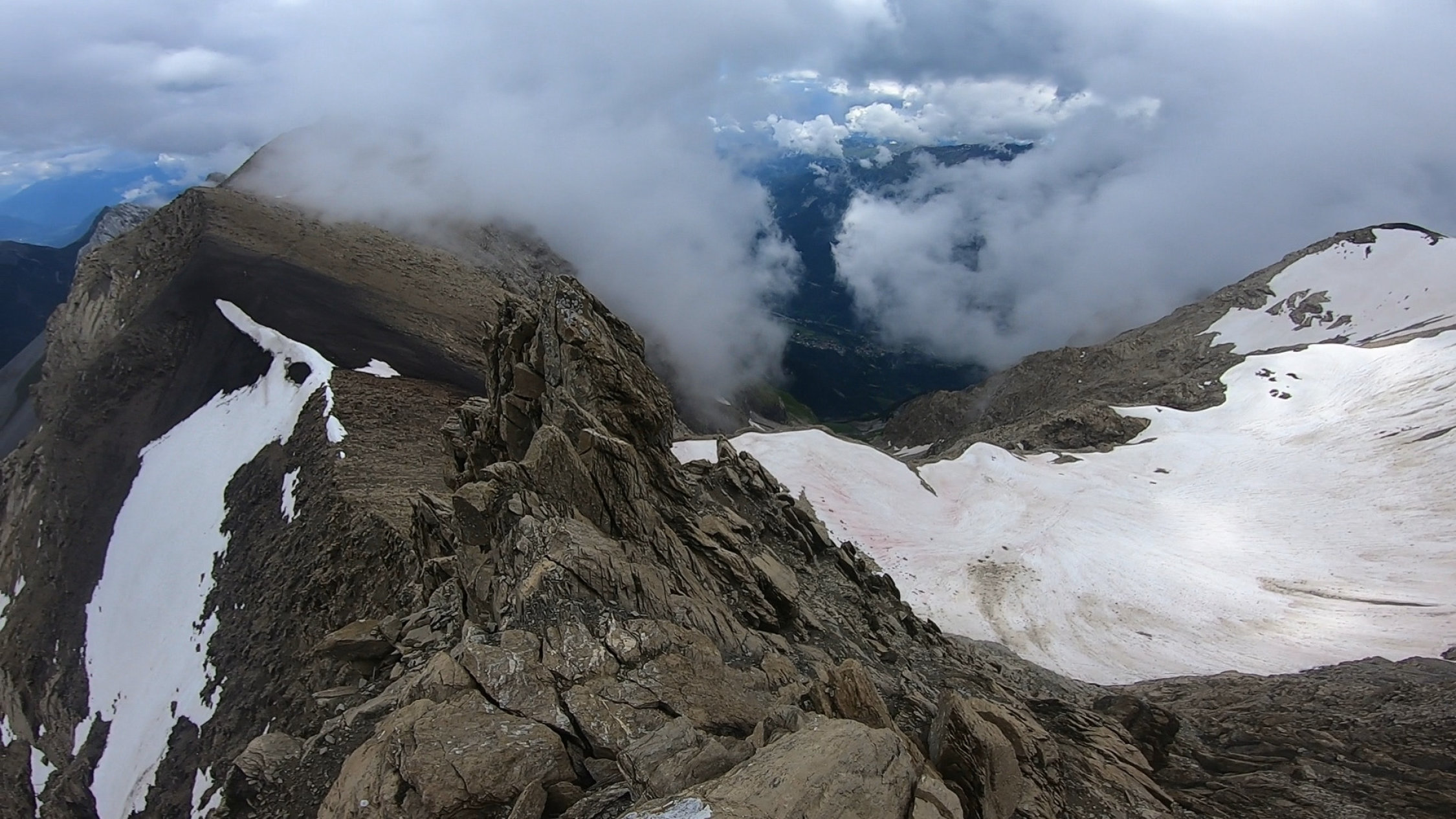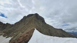 Abstieg durch die Südwand soweit problemlos bis auf die Randkluft des Grinnerferners. Die Kluft zwischen Fels und Schnee ist zum Teil schon sehr groß.