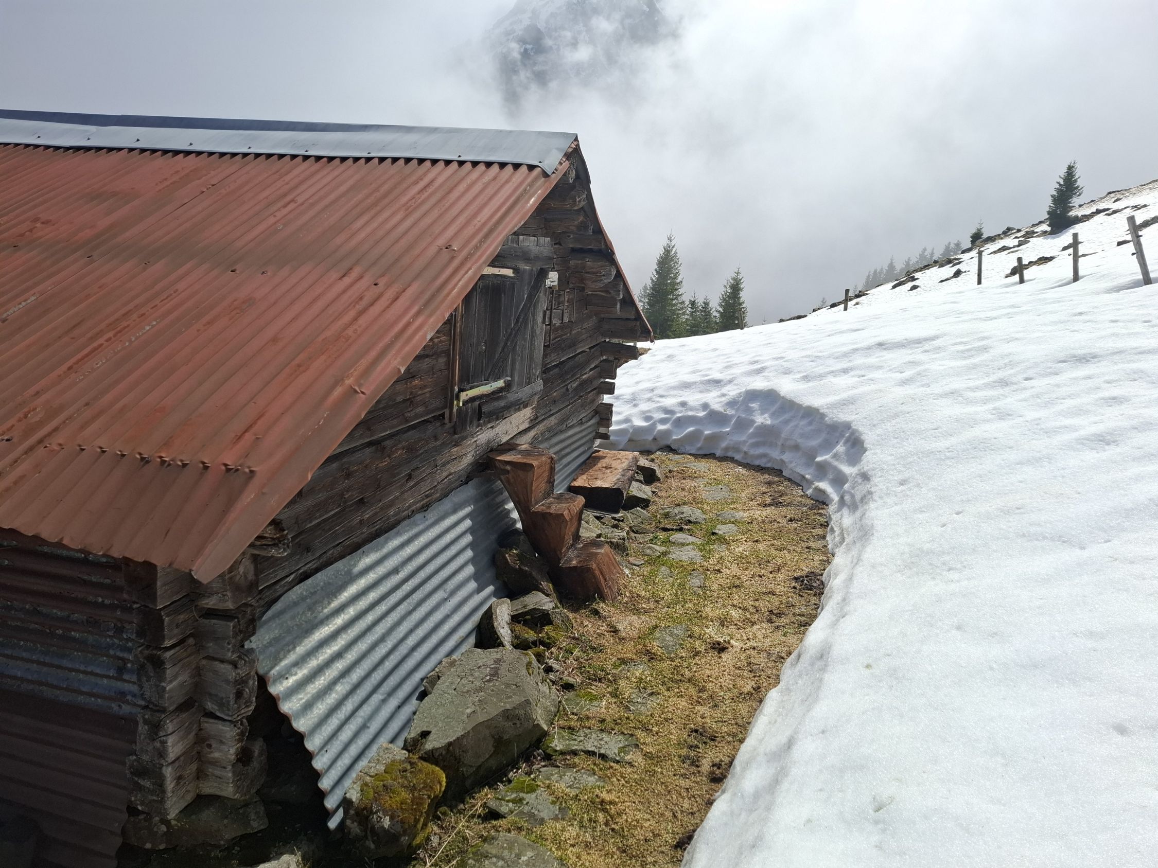 Mit dem Bähnli von Witerschwanden zum Eggenbergli hinauf, Dem Waldweg entlang zum Steinboden. Abstieg zum Wegweiser, kurzer Gegenanstieg zur Alp Unter Wängi. Noch liegt einiges an Schnee auf der Route oft "wadentief" eingebrochen. Das heutige Wandermotto: "Der mit dem Nebel tanzt!"