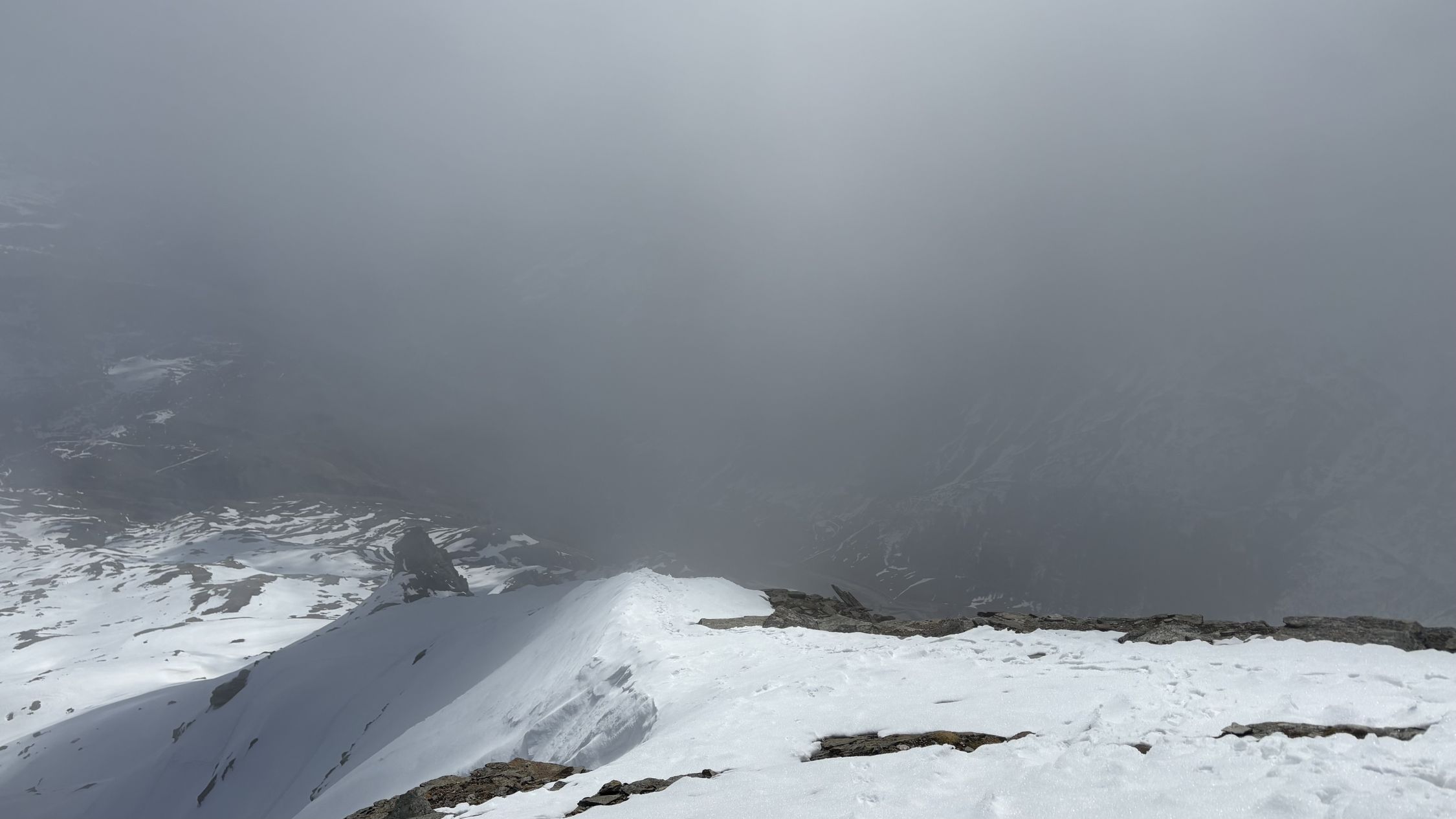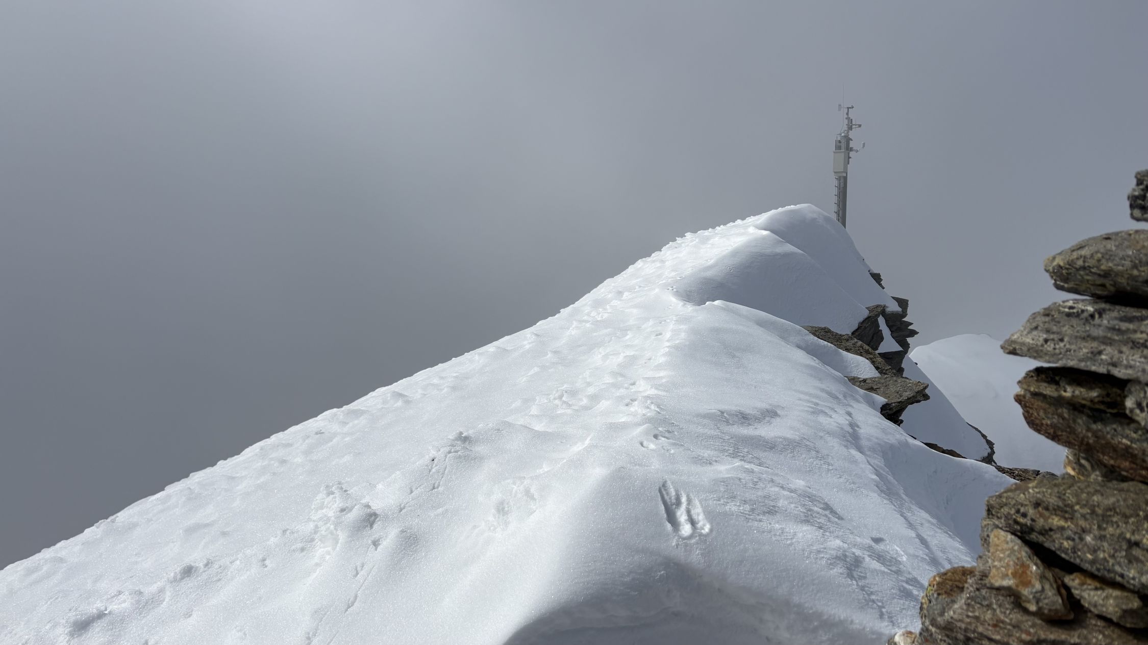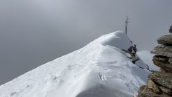 Mir blieben noch die letzten 50 Meter bis zum menschenleeren Gipfel, das erstemal, so weit ich mich erinnern kann. Die Sicht war wegen der Bisewolken etwas eingeschränkt und bei dem zügigen Wind hätte selbst Bergrider seine Hosen zugeknüpft…