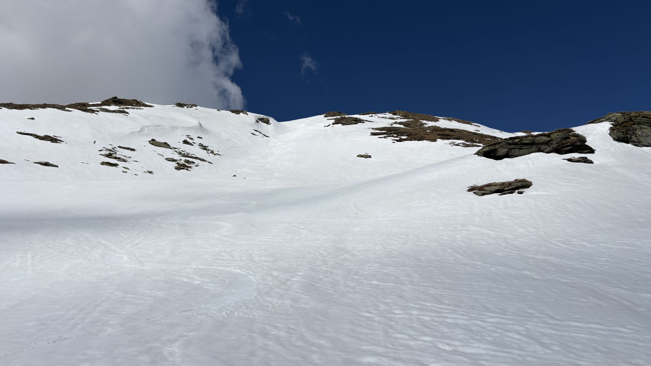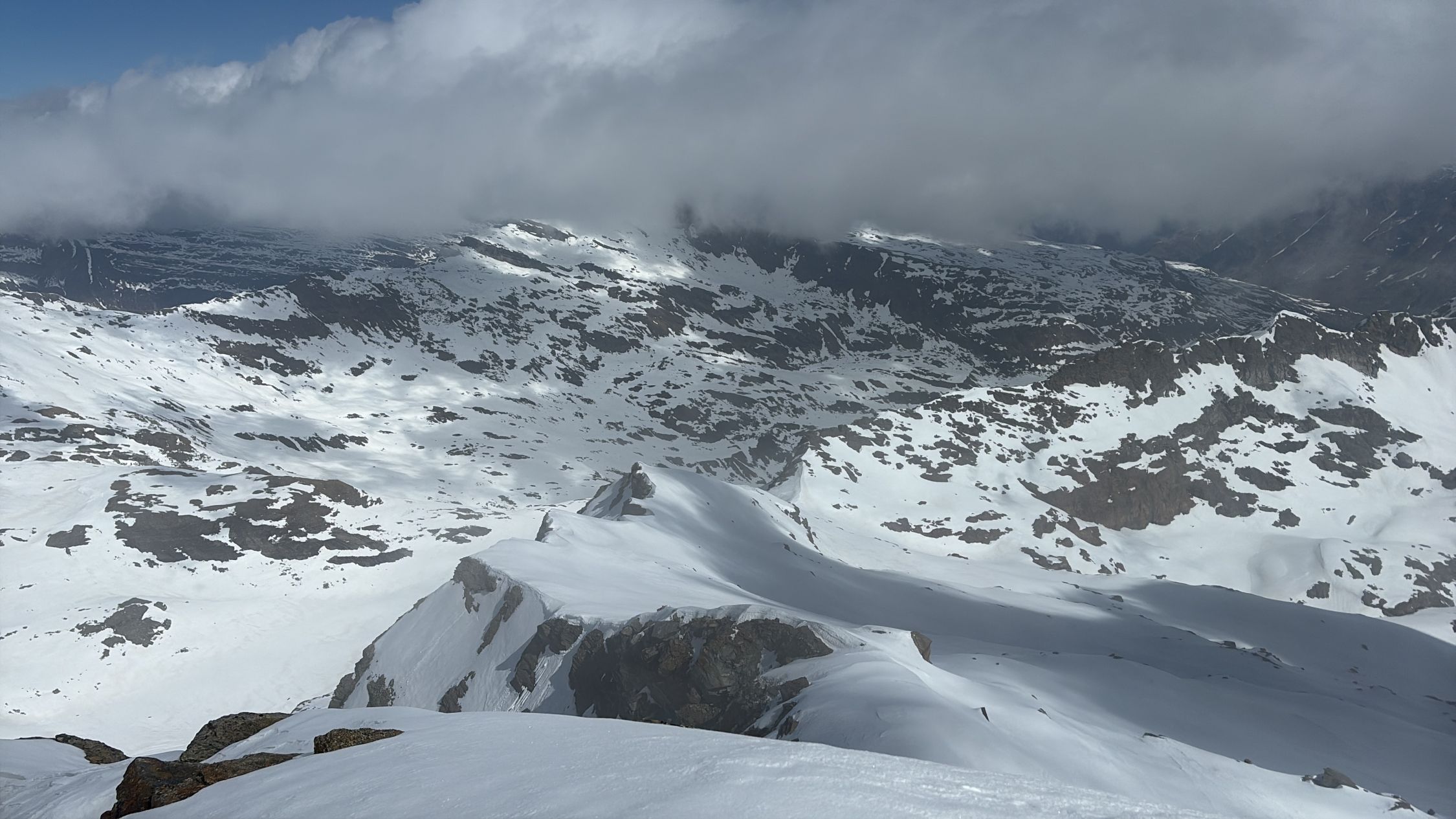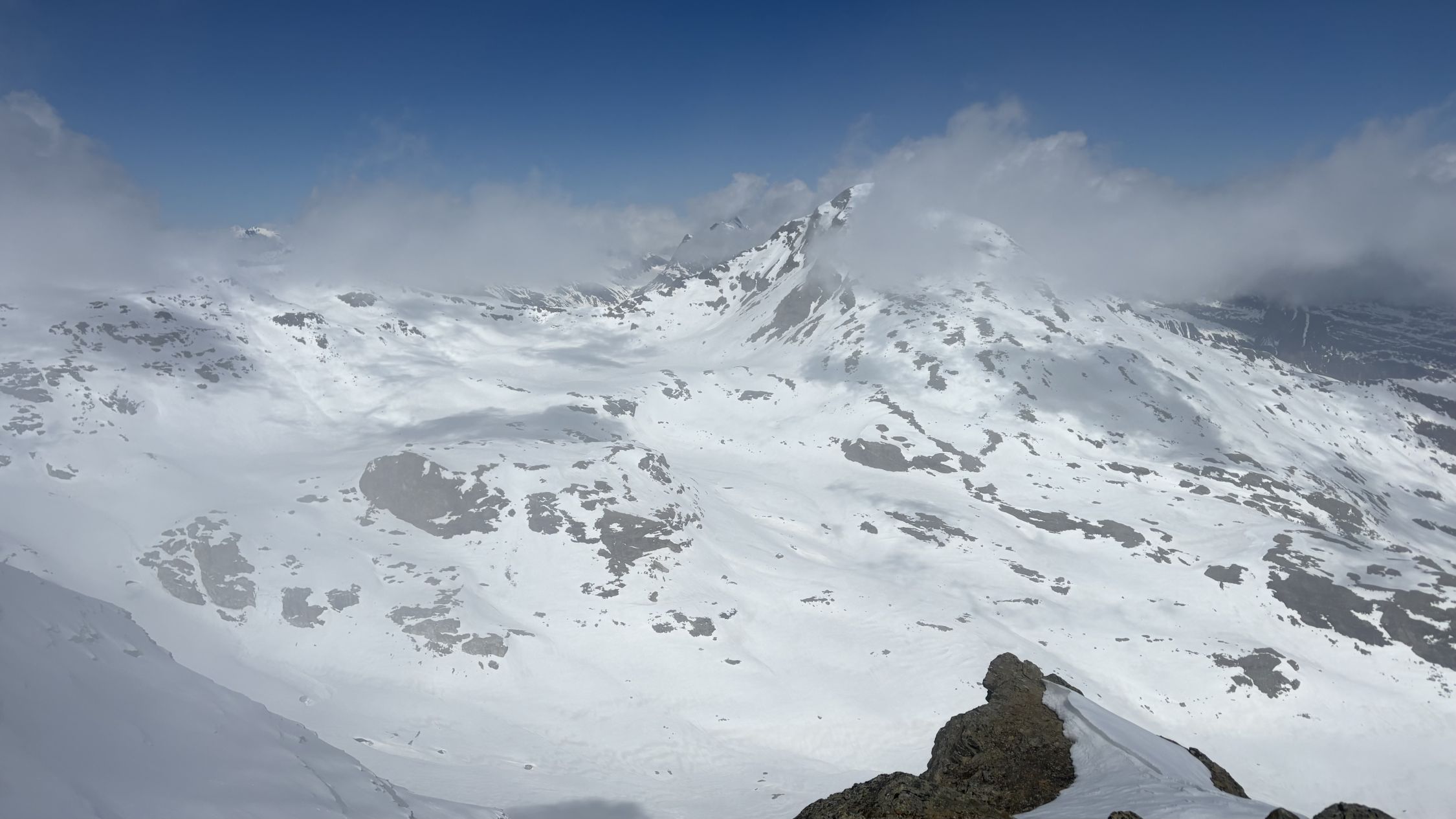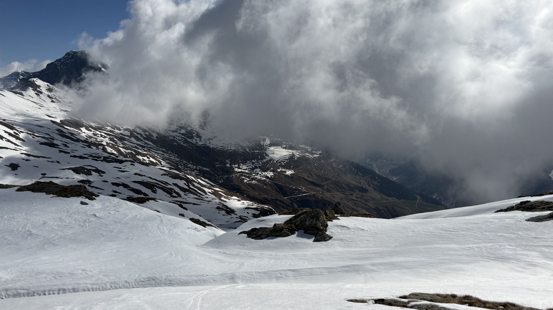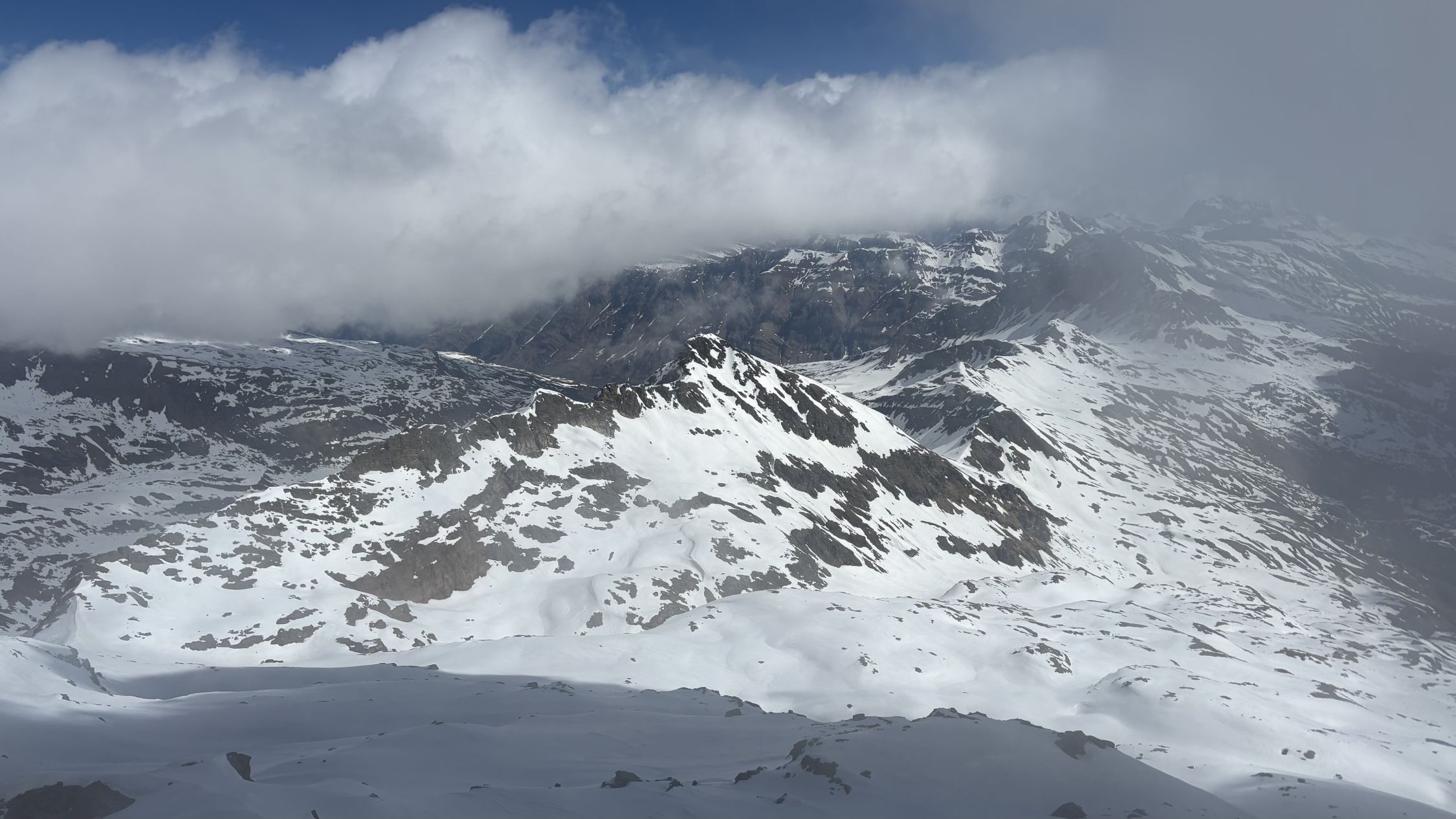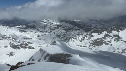 Die Abfahrt (11.00) war oben hart mit einem 3cm Pulverflümli. Ende Gletscher wurde es sulzig, ohne Einsinken oder faul zu werden.