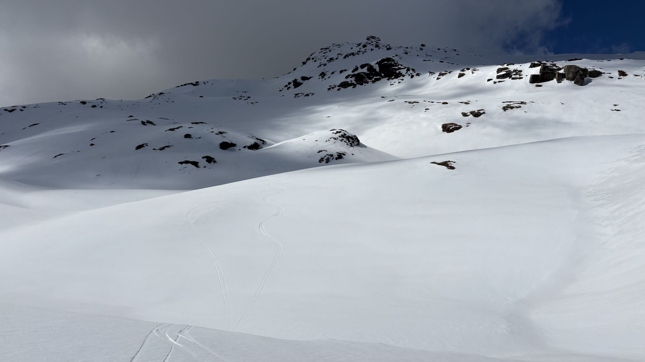 Ab Höhe 2200 stiess ich plötzlich auf eine frische Spur. Je länger ich dieser folgte, desto klarer wurde, dass es sich hier um eine sehr ortskundige Person mit einem leichten Ski handeln musste.