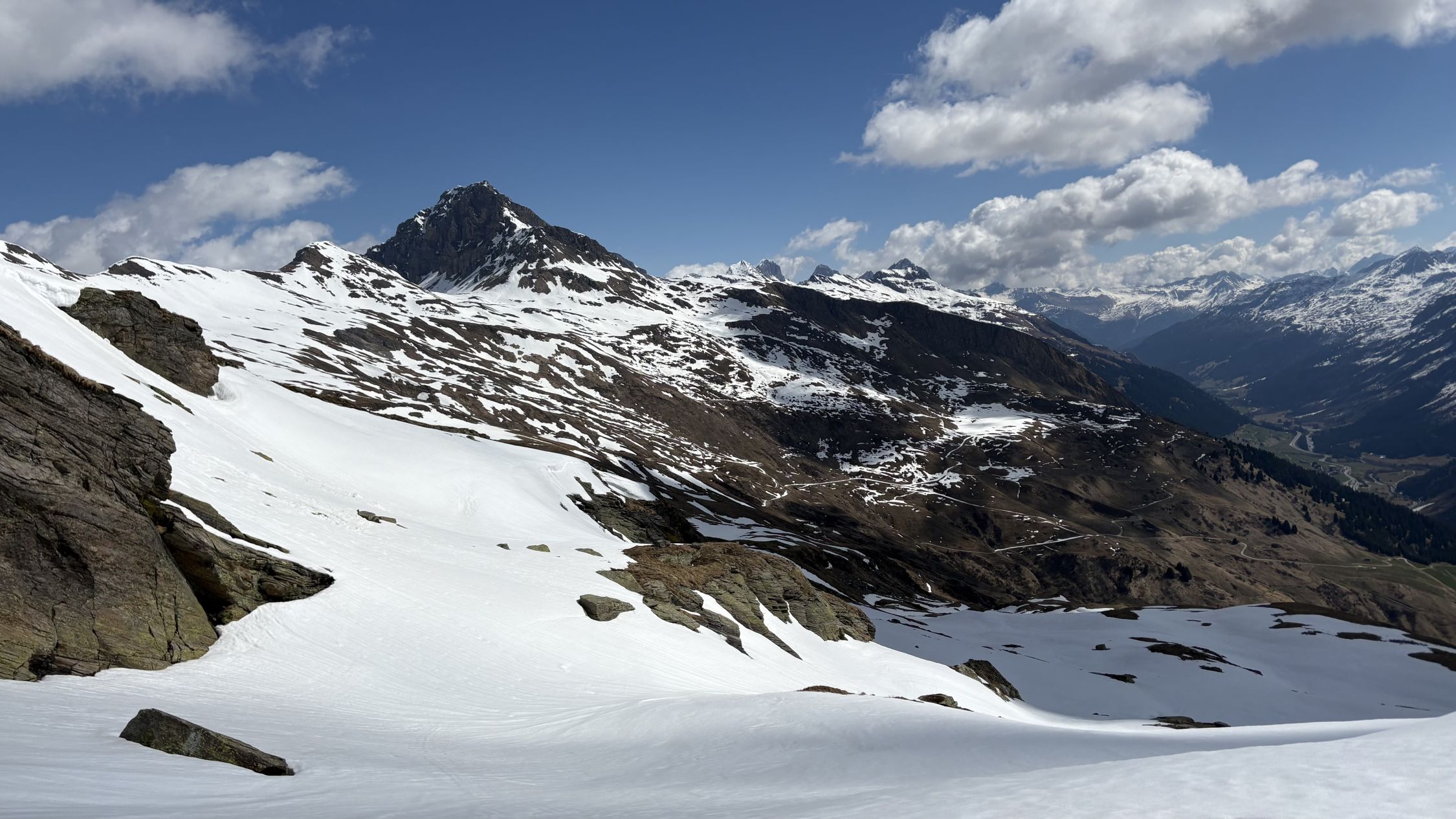 Ab der Alp konnte ich endlich die ausgedehnten Sulzhänge skischiebend geniessen und jene studieren, die am weitesten hinunterreichten für die Abfahrt.