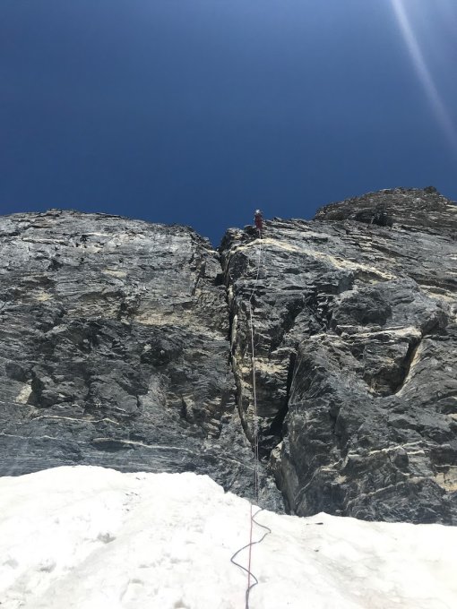 Abseilpiste ist von unten (und oben) nicht gut Sichtbar. Wenn man am Fixseil hochgeht und anschliessend das geröllige Culoir passiert anschliessend nach unten Schauen! Von Oben gesehen links vom grossen Steinmandali ist eine saubere Abseilstelle, mit 50m Doppelseil kommt man bis zum Firn runter. Mit 50m Einfachseil hat es einen Zwischenstand in der Hälfte.