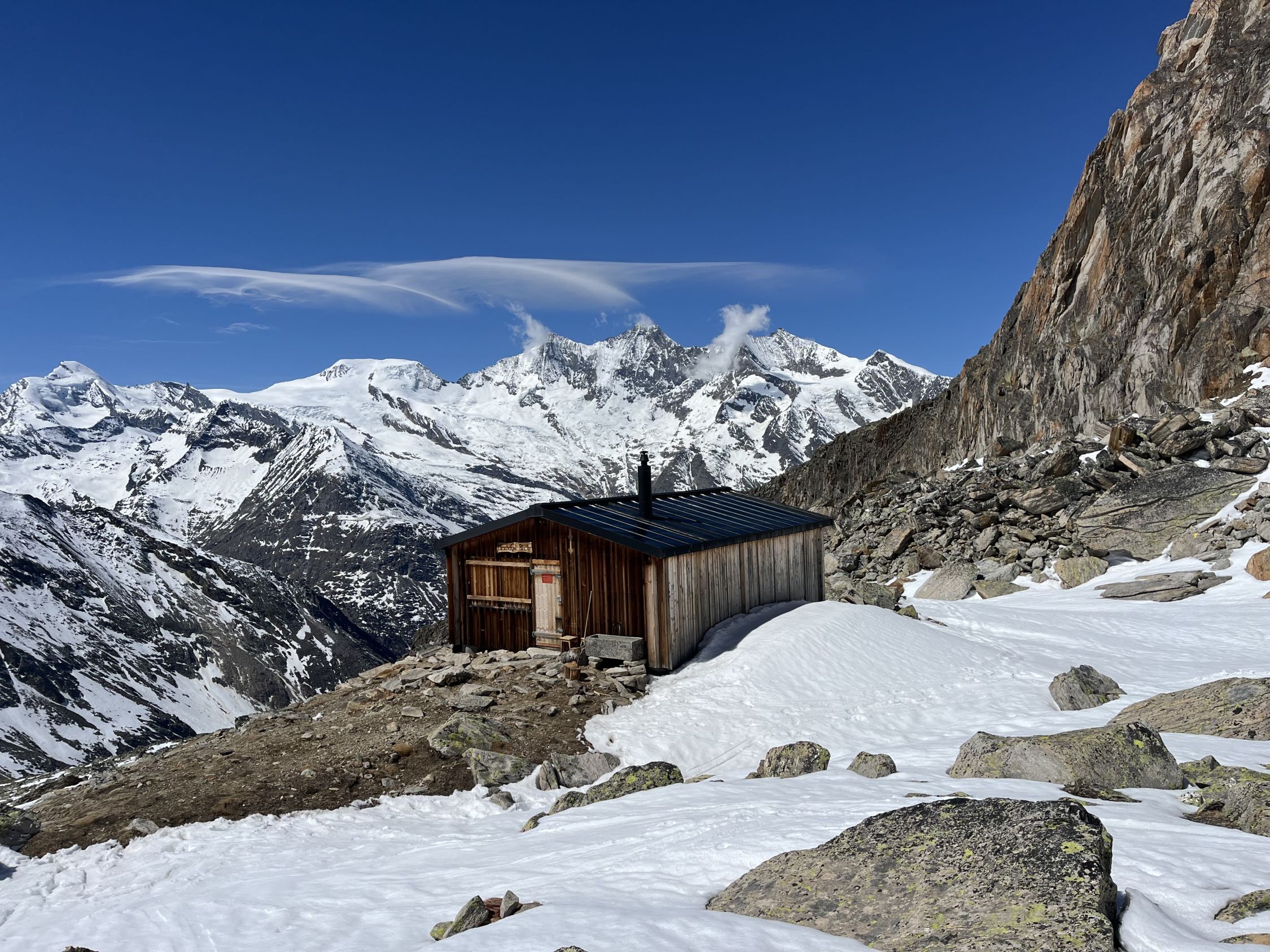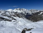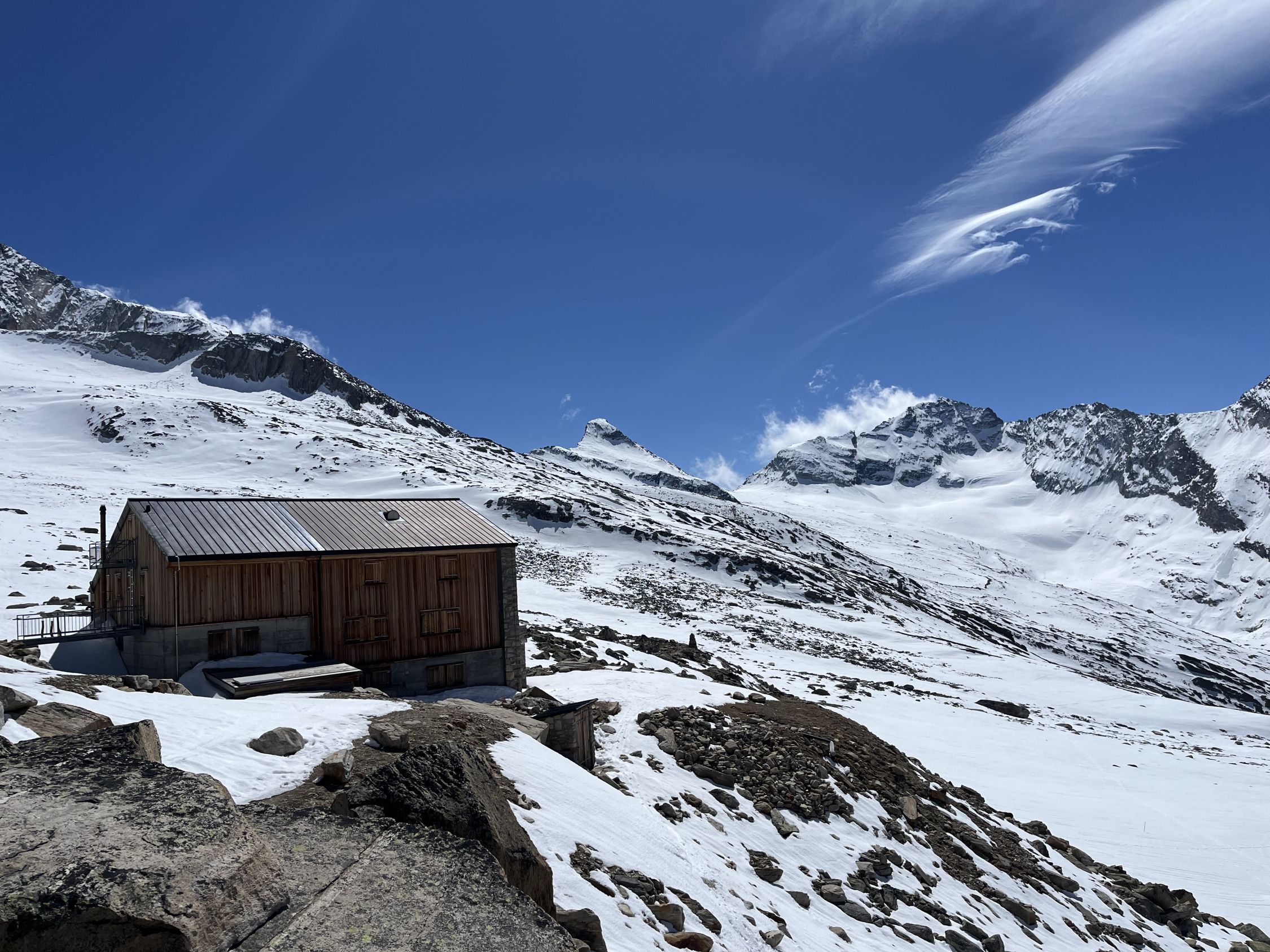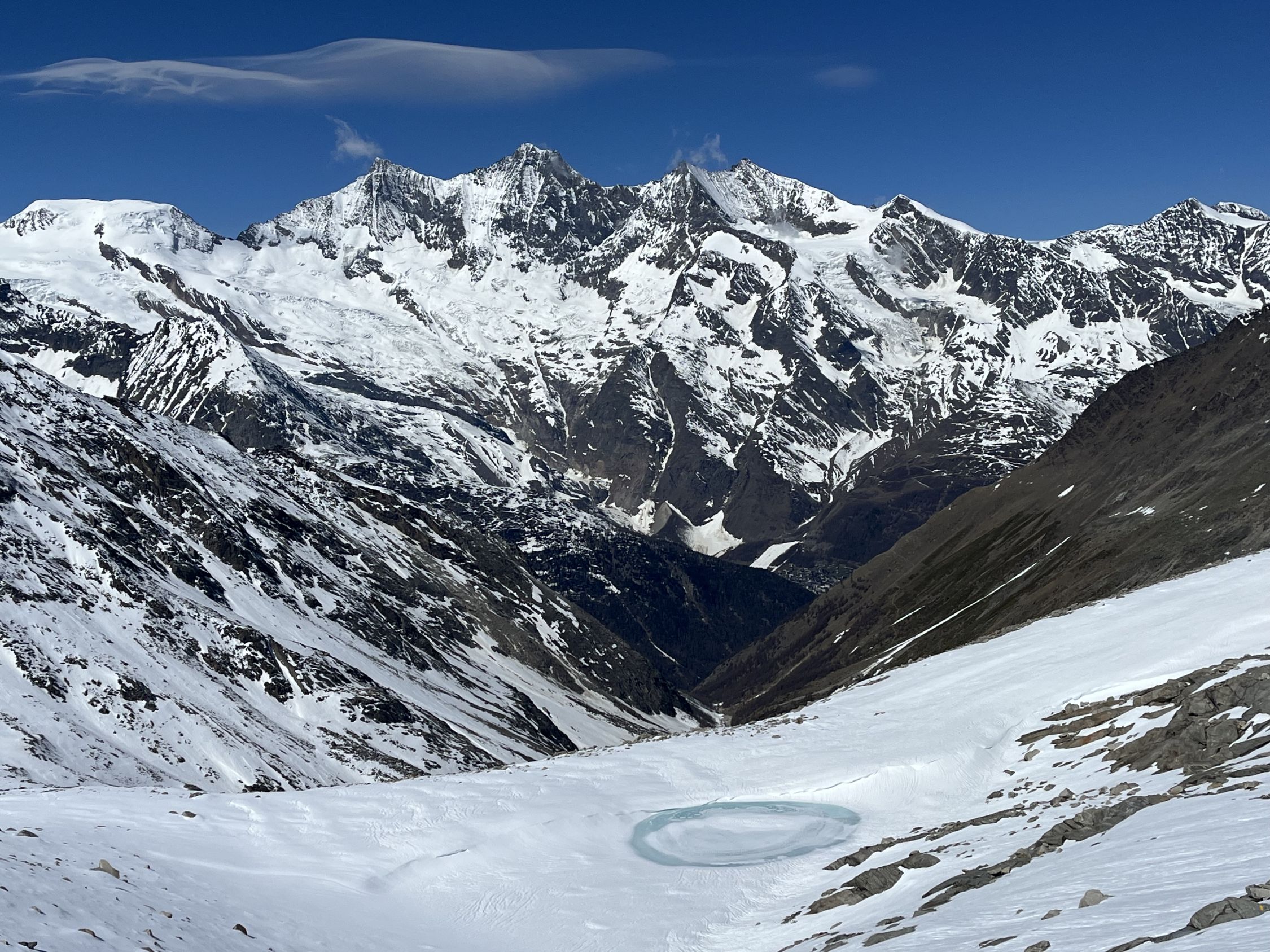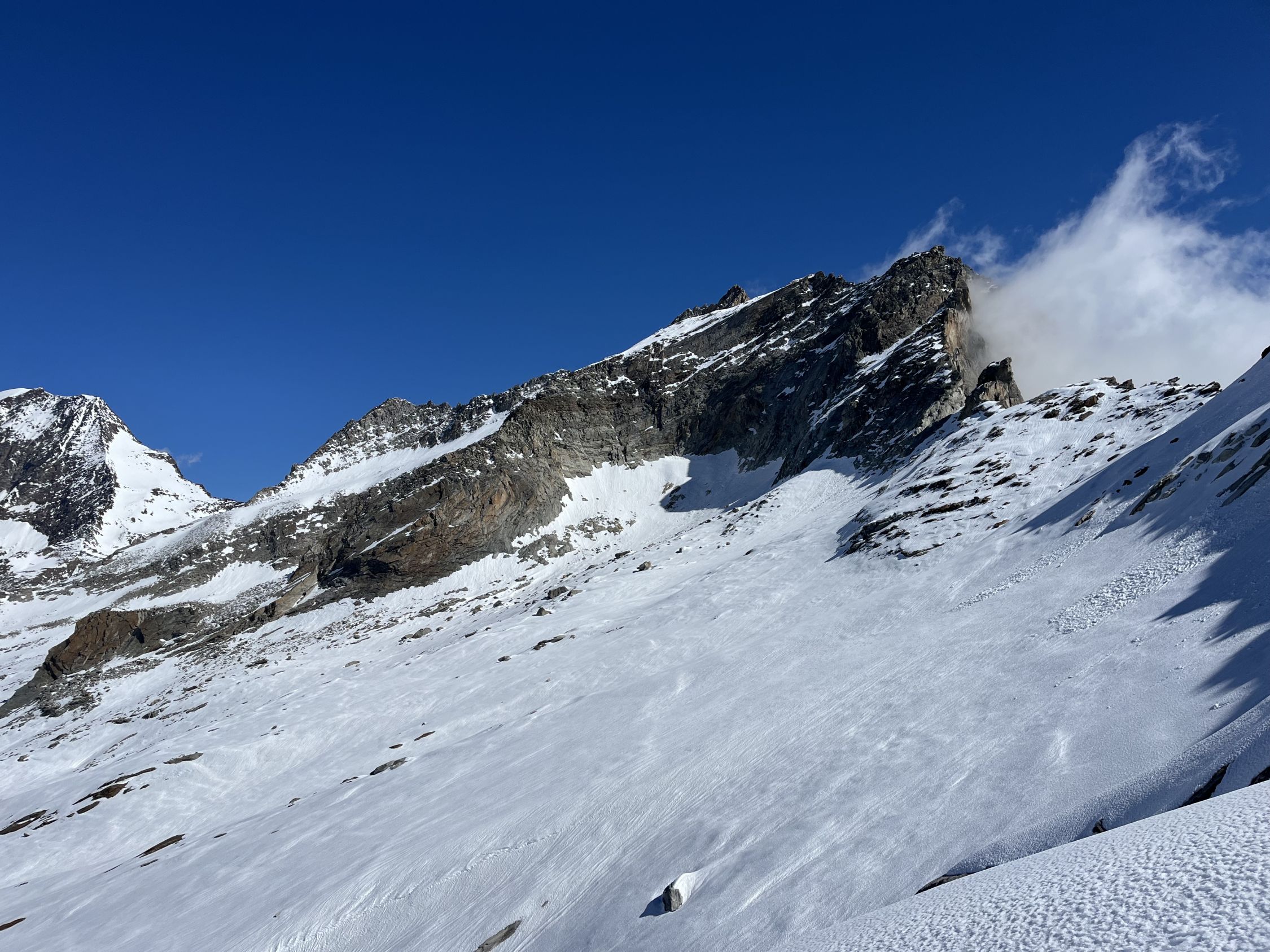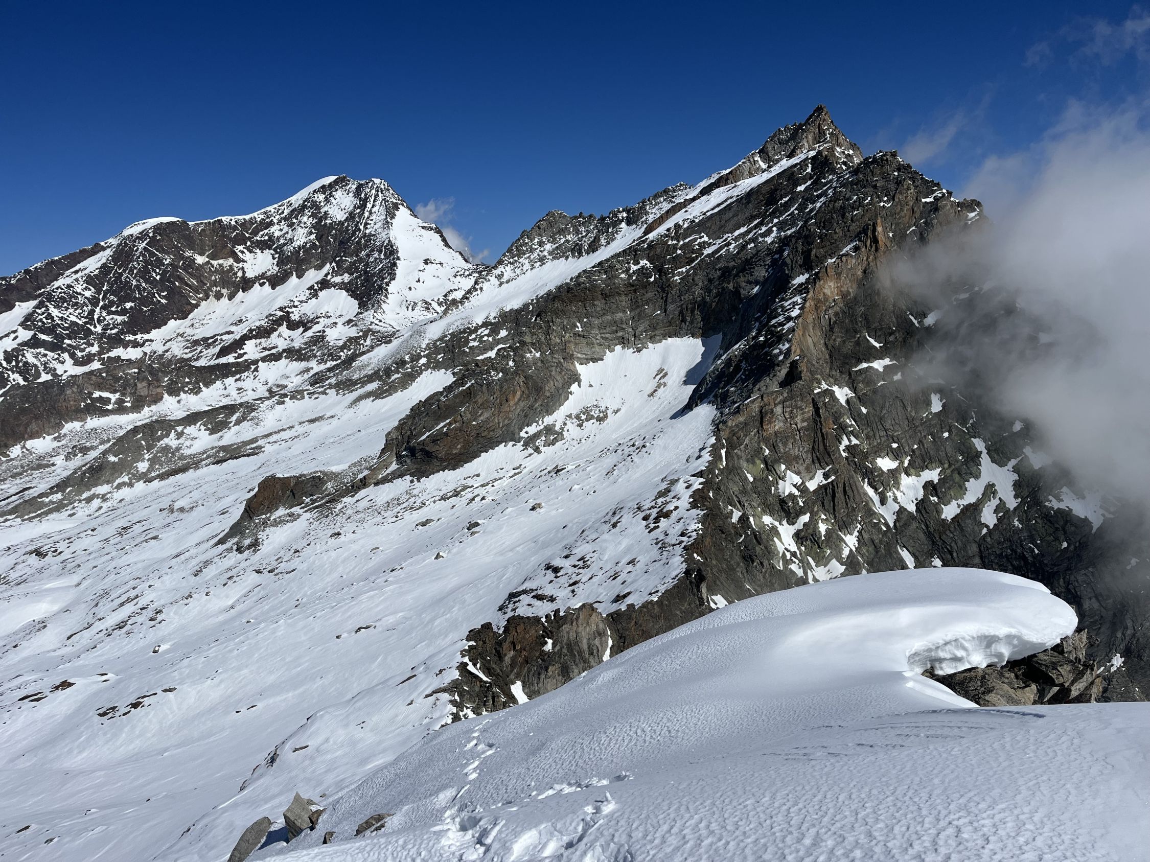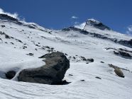Einige Spuren von der Almagellerhütte Richtung Weissmies. Unterhalb der Almagellerhütte kann man je nach Routenwahl fast alles auf Schnee runter bis zur Almagelleralp. Auch beim Steilhang hinunter nach Saas Almagell kann man in einem schneegefüllten Tälchen bis an den Dorfrand kommen.