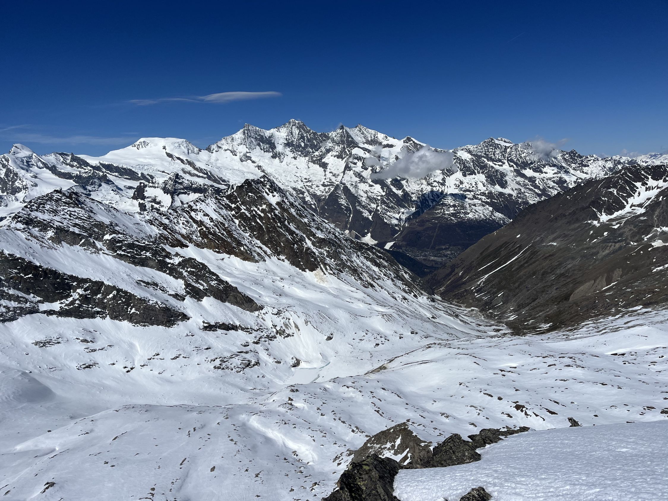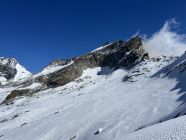 Im Aufstieg meist aper bis Almagelleralp. Dann gut tragender Schnee. Im Gipfelhang einige Stellen (NW) mit schönem Pulver, somit ganze Route mit SS begehbar. Auf dem Gipfel kalt und windig. Leider wegen Quellwolken kaum Aussicht Richtung Italien.