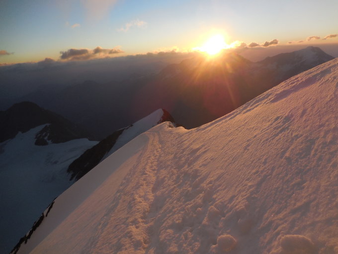 Hohbalmgletscher und NO-Grat noch gut eingeschneit. Im oberen Teil des Grates werden die beiden Umgehungen der Felsen im N-Hang langsam eisig und somit heikel, deshalb ist es bald empfehlenswert direkt über die Felsen aufzusteigen. Temperatur sehr hoch für diese Höhe, auch in der Nacht, deshalb war der Schnee in der unteren Hälfte des Grates bereits um 8:30 sehr aufgeweicht.