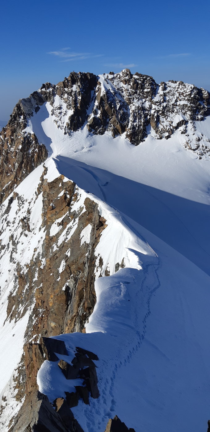 Grat vom Silbersattel bis zum Gipfelaufbau perfekter Trittschnee und kein Blankeis. Abstieg vom Silbersattel super Spur mit kurzer, steiler Stelle über kleinen Serac unterhalb mächtiger Seracs. Runterfallen darf dort nichts. Bruch am Gletscherbeginn mittlerweile aper. Zustieg zum Silbersattel verlief über Dufourspitze mit Abseilerei.