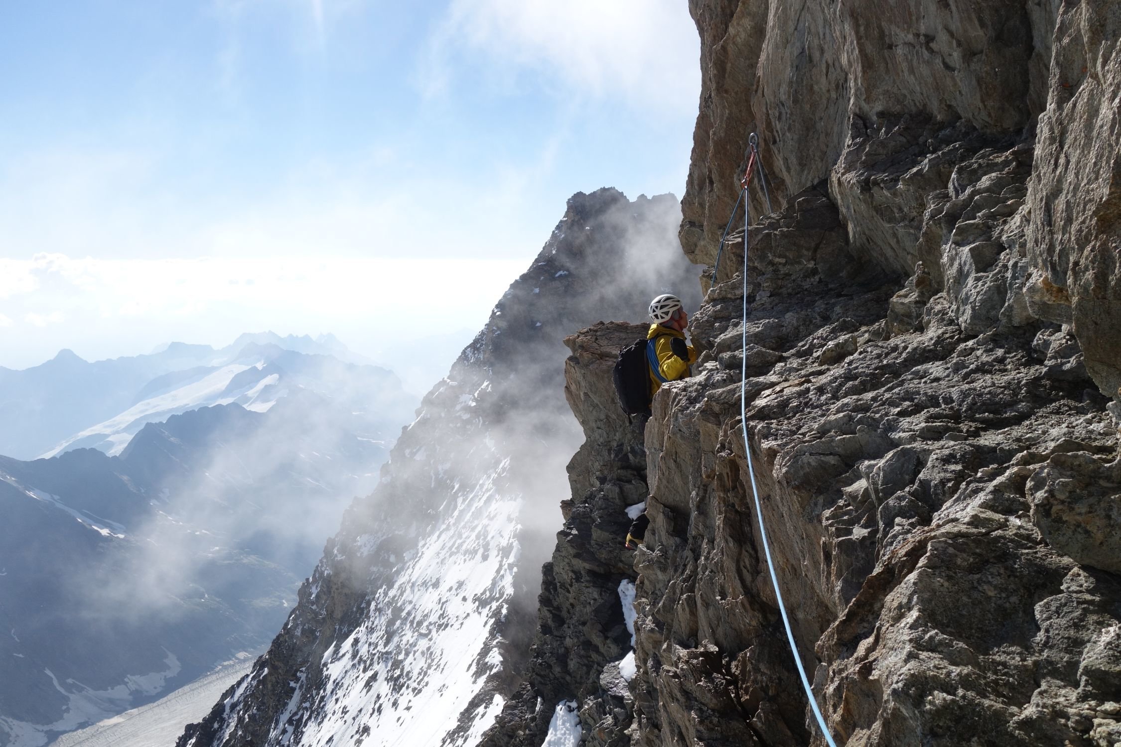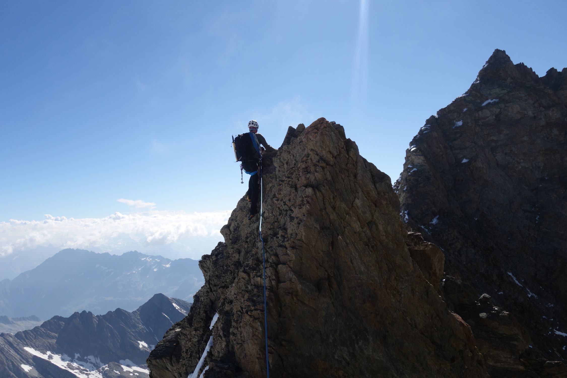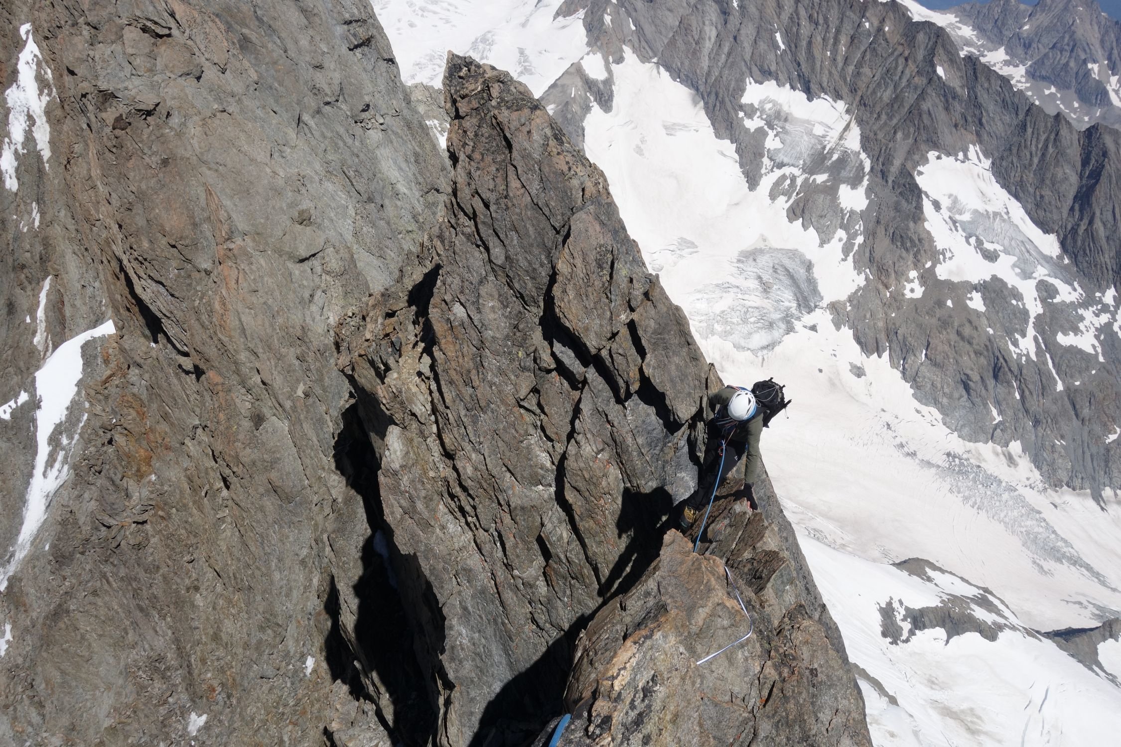 Ein herrlicher aber langer Grat der Ausdauer in grosser Höhe erfordert. Immer tauchen nochmal ein paar Türmchen mehr vor einem auf die überklettert werden wollen. Hat Ähnlichkeiten mit der Grandes Jorasses Überschreitung (aber weniger heikel) oder mit dem Teufelsgrat am Tacul (aber die Türme sind am Lauteraargrat kleiner). Ein ganzer Grad schwerer als der Normalweg auf's Schreckhorn. Schlingen und kleine Friends nützlich.