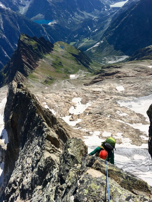 In 15h vom Hotel Handegg, Tür zu Tür. Cams # 0.3 - 1 (+ eventuell #2), Schlingen, 8 Express/Extenders. Die Schwierigkeiten (V+) sind am grossen Turm, dort finden man die meisten Rostgurken. Ausreichend Wasser mitnehmen, man ist lange in der Sonne...
