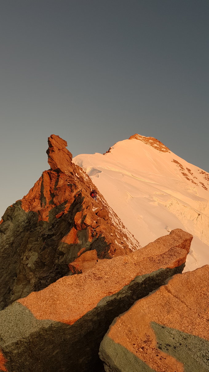 Topverhältnisse. Wenig Schnee auf dem Ostgrat und ab dem Firngrat gut eingeschneit, kein Eis und tragend.