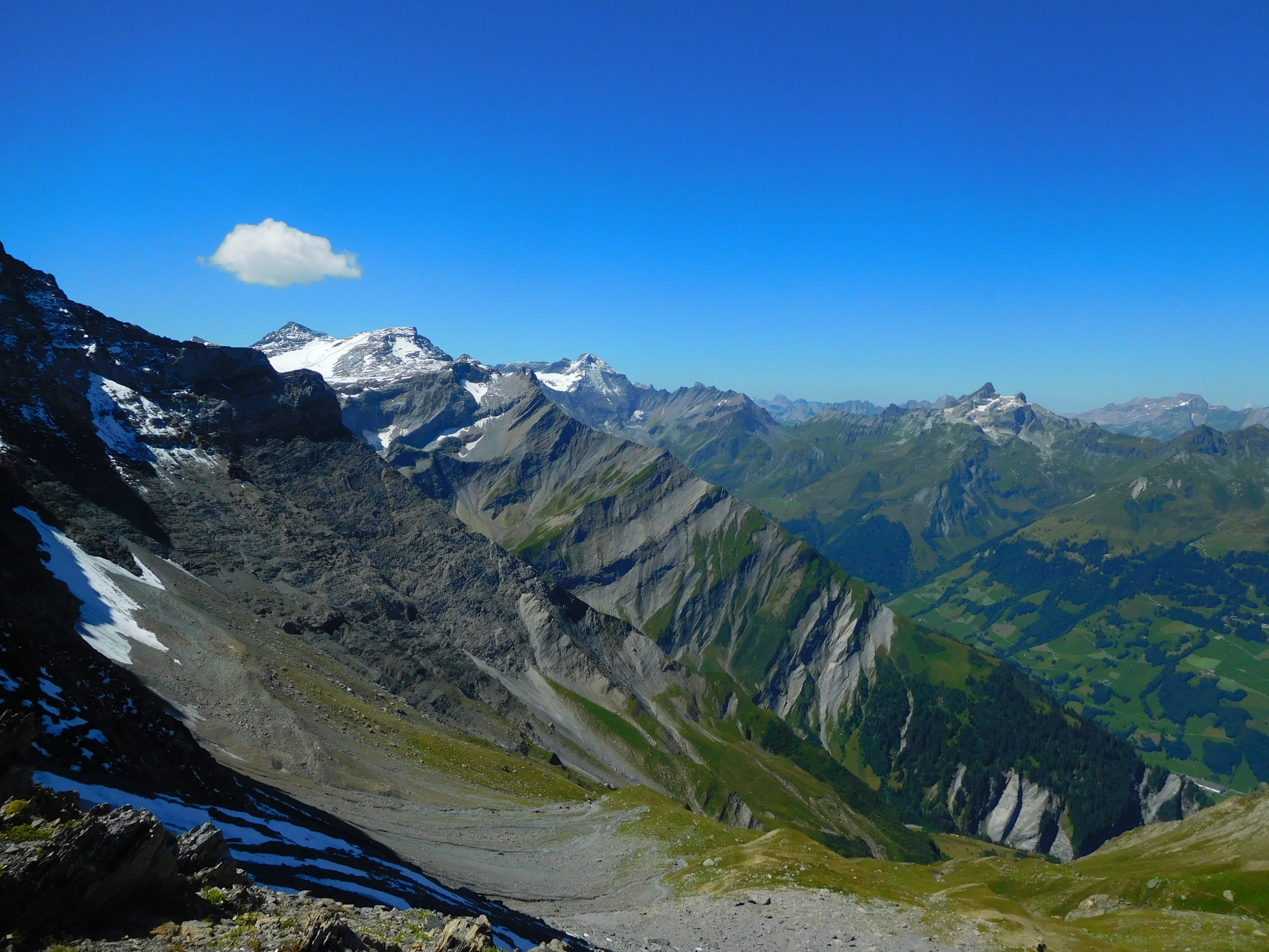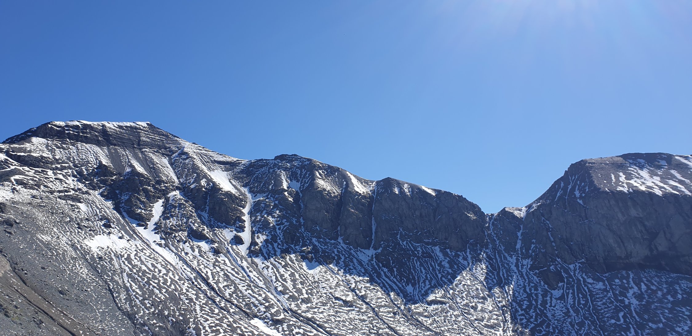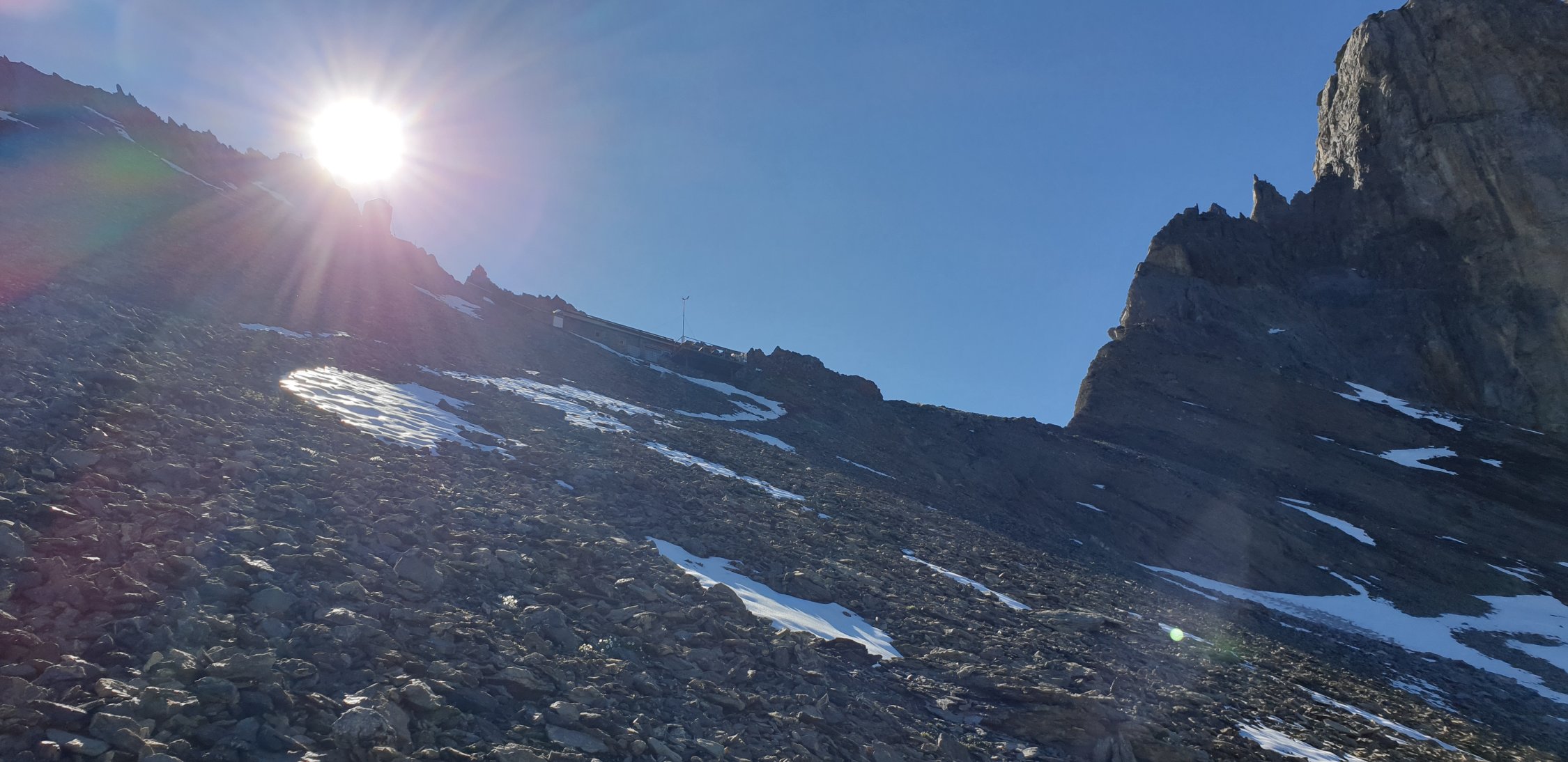 Start der Tour am 8.15 Uhr bei der Bergstation Tschinglen , der Aufstieg ging steil, aber immer im Schatten hoch zum Segnespass, der Neuschnee war der letzten Tage war schon ziemlich weggeschmolzen, nach kurzem Abstieg in Richtung Muletg da Sterls da mühsamer Aufstieg durch Geröllhalde, das Drahtseil war von der Verankerung los , der Schlussaufstieg dann recht schwierig