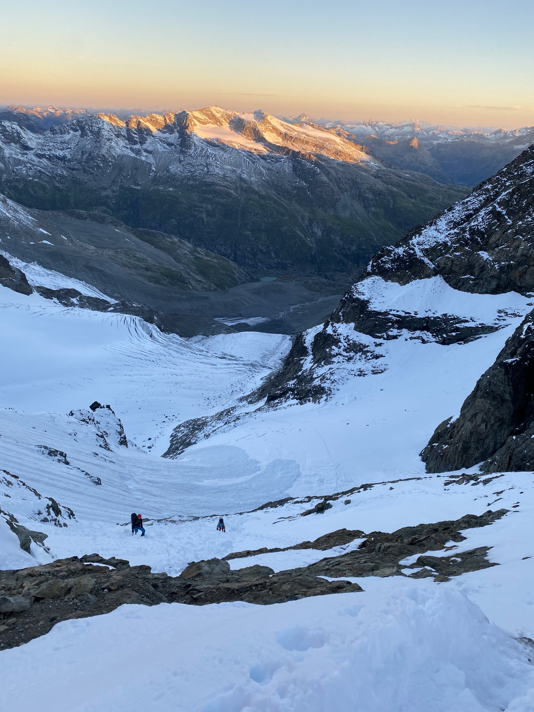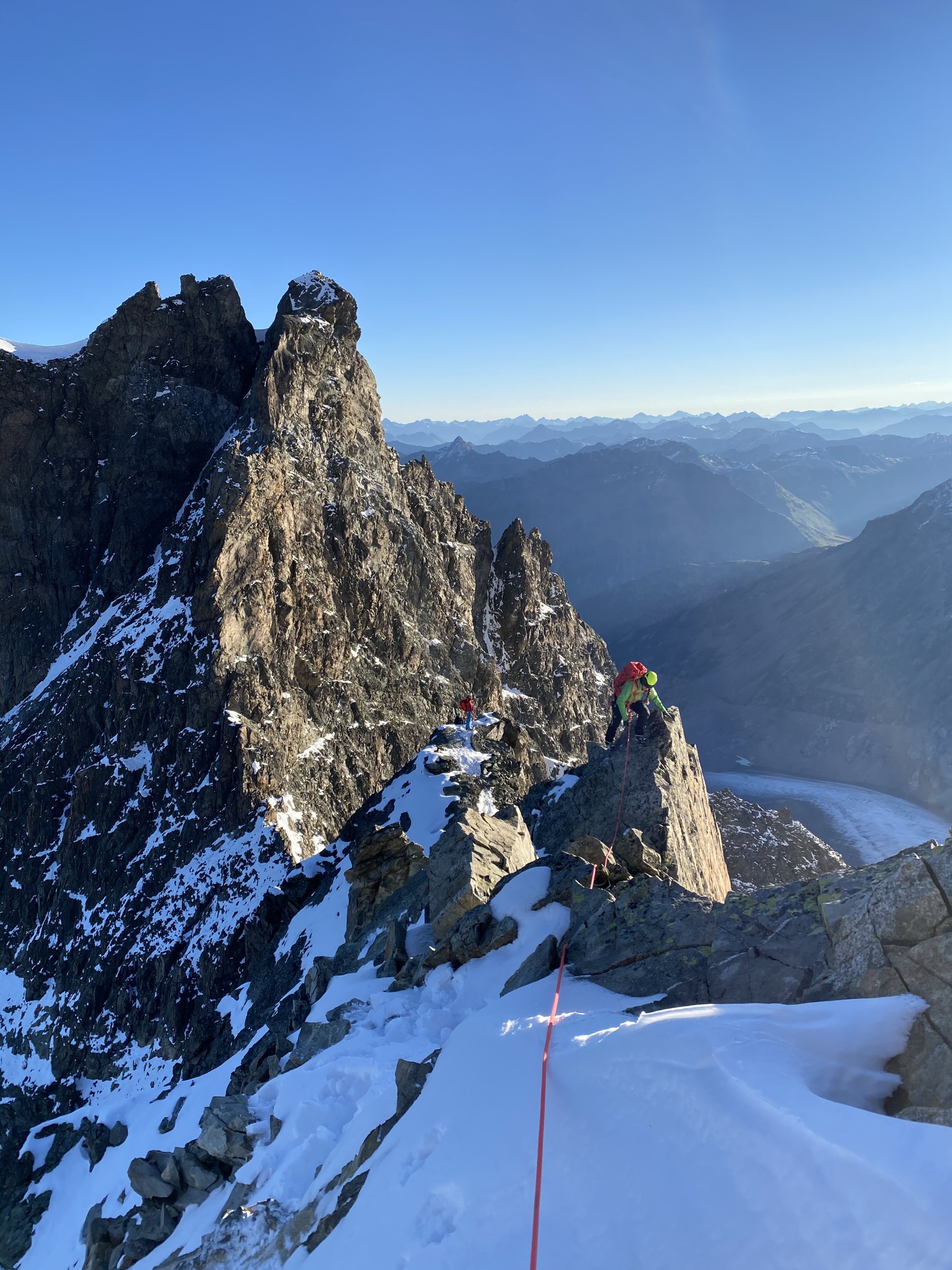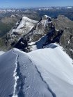 Nach dem Wintereinbruch vom Wochenanfang war die Route am 05.08.20 noch nicht begehbar (Alle Seilschaften drehten vor der Fuorcla um). Am 06.08 hat sich der Schnee soweit gesetzt, dass die Bedingungen ideal waren. Die Fuorcla war sehr gut über die Firnflanke begehbar. Am gesamten Felsgrat lag noch Schnee - war also mit Steigeisen zu klettern. Umgehung der Haifischflosse war noch sehr gut möglich. Der Biancograt wurde von einer Seilschaft vor uns frisch gespurt (danke dafür!) und war entsprechend einfach zu gehen. Übergang vom Bianco zum Bernina mit Schnee aber problemlos. Generell noch sehr viel Neuschnee (auch im Abstieg) der Nachmittags extrem tief wird.