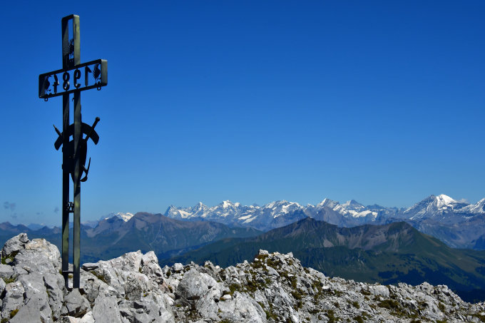 Am Gipfelgrat wird man von den Klängen der Alphörner, die auf der Terrasse vom Bergrestaurant Videmanette gespielt wurden, empfangen. Die Reichweite ist also recht gross! Das Schmiedeisernen Gipfelkreuz ist wunderschön! Auch der Rundblick ist herrlich aber weil der Gipfel relativ isoliert liegt, sind die meisten Berge weit weg also Fernrohr mitnehmen und auf Entdeckungstour! Auch der Genfersee ist sichtbar!