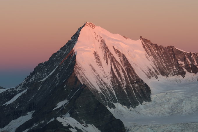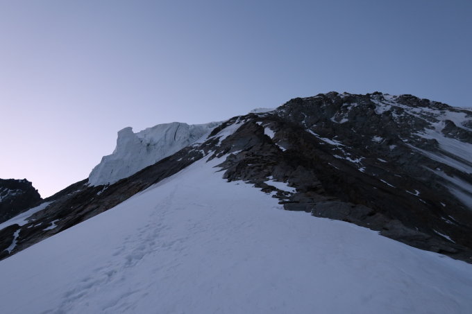 Sehr gute Verhältnisse am Festigrat. An einigen Stellen tritt das Blankeis hervor. Wir benutzten je 2 Eisgeräte. Im oberen Teil super Trittfirn.