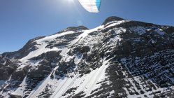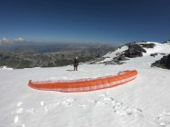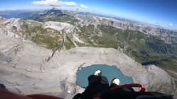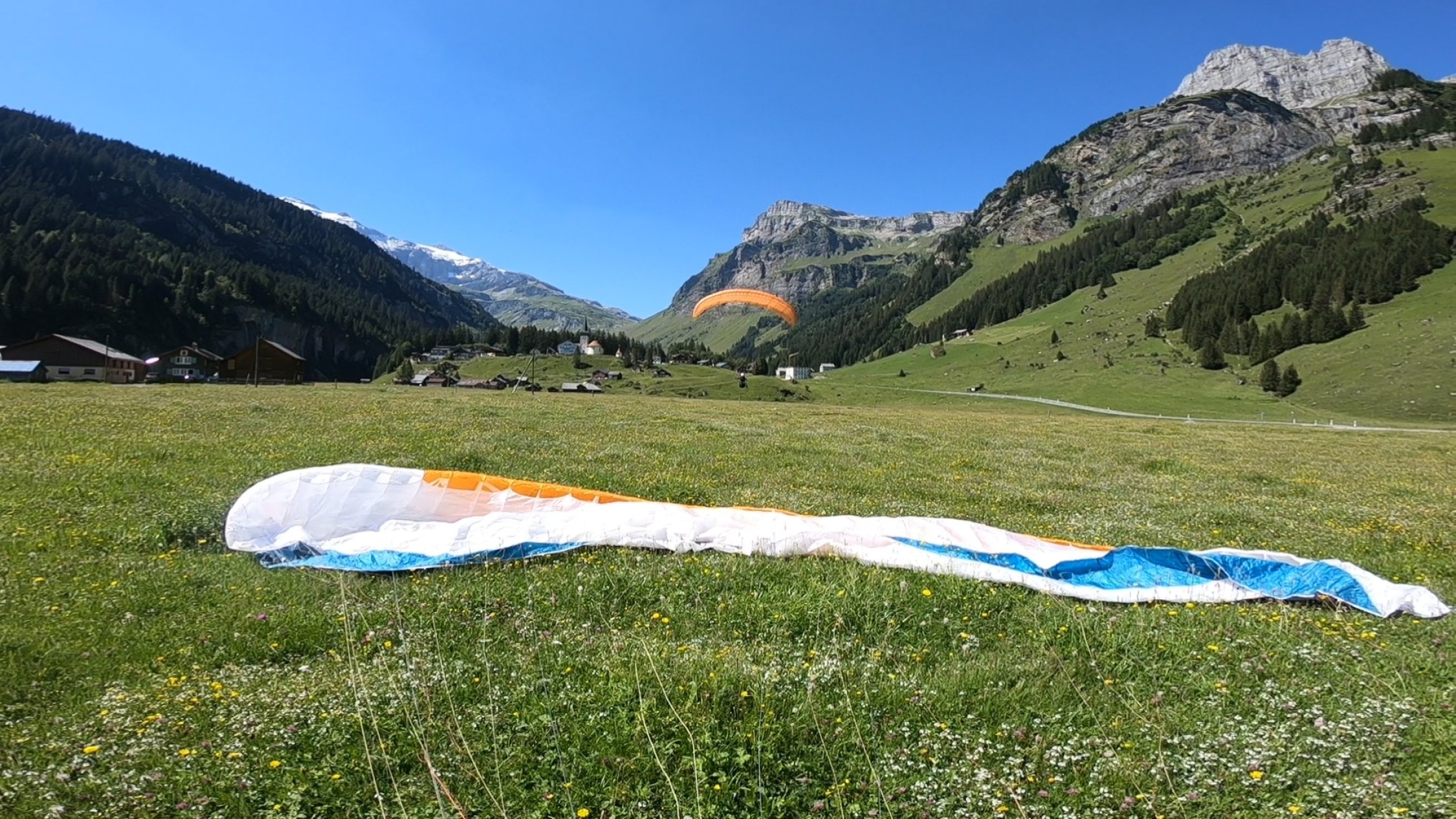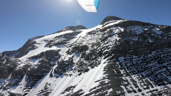 Vom östlichen Rand des Gletschers aus (ca. Punkt 3083) sind wir mit unseren Gleitschirmen nach Urnerboden geflogen. Das Starten mit ca. 10 kmh Nordwind war perfekt, wir landeten ca. um 12.00 Uhr mit geschätzten 20 kmh Talwind.