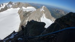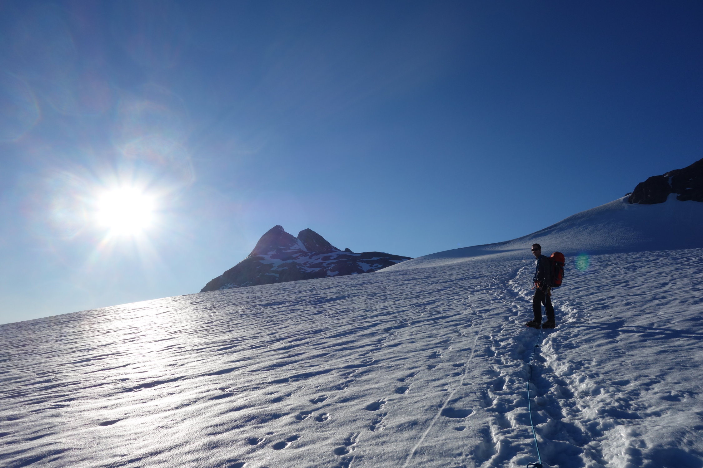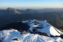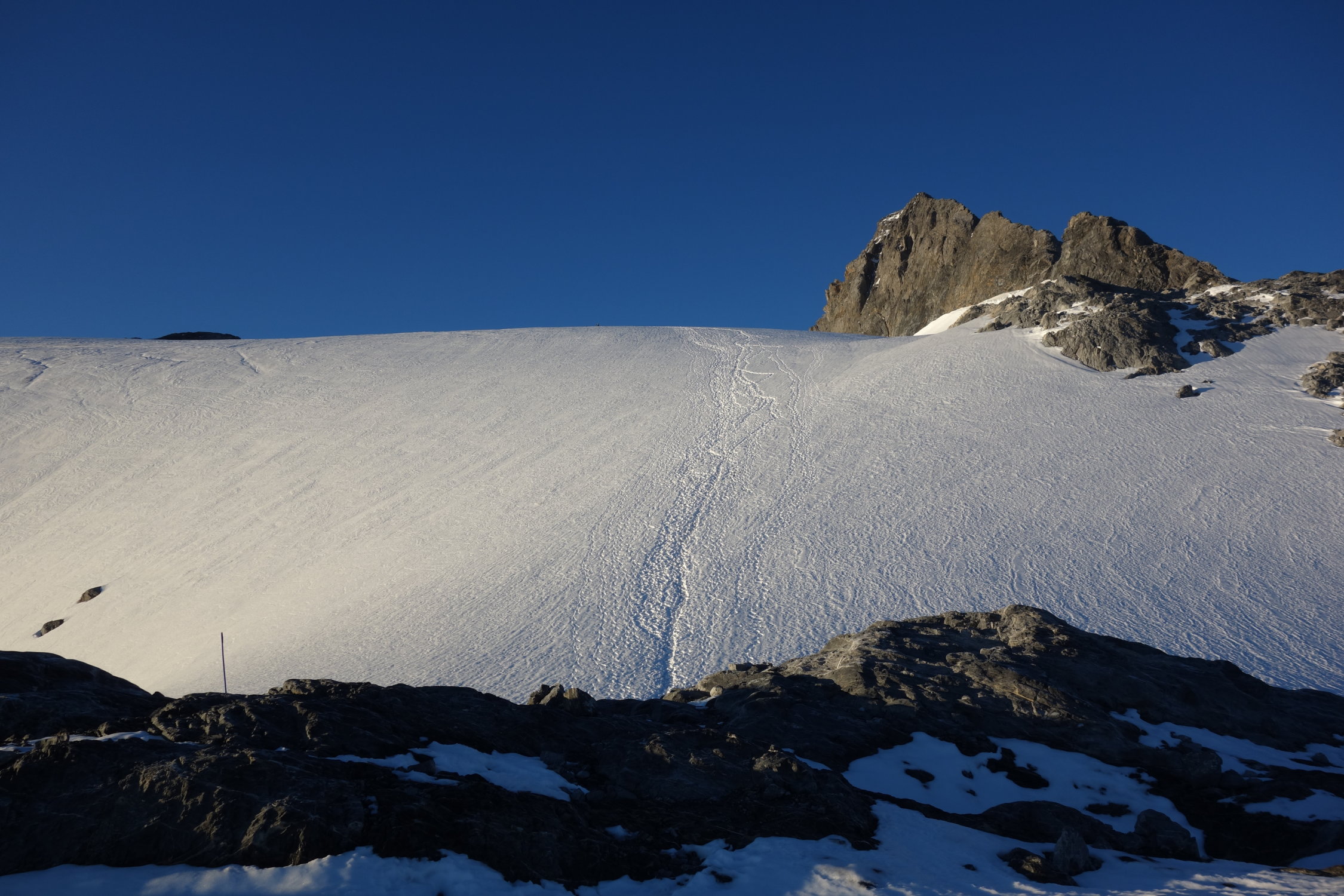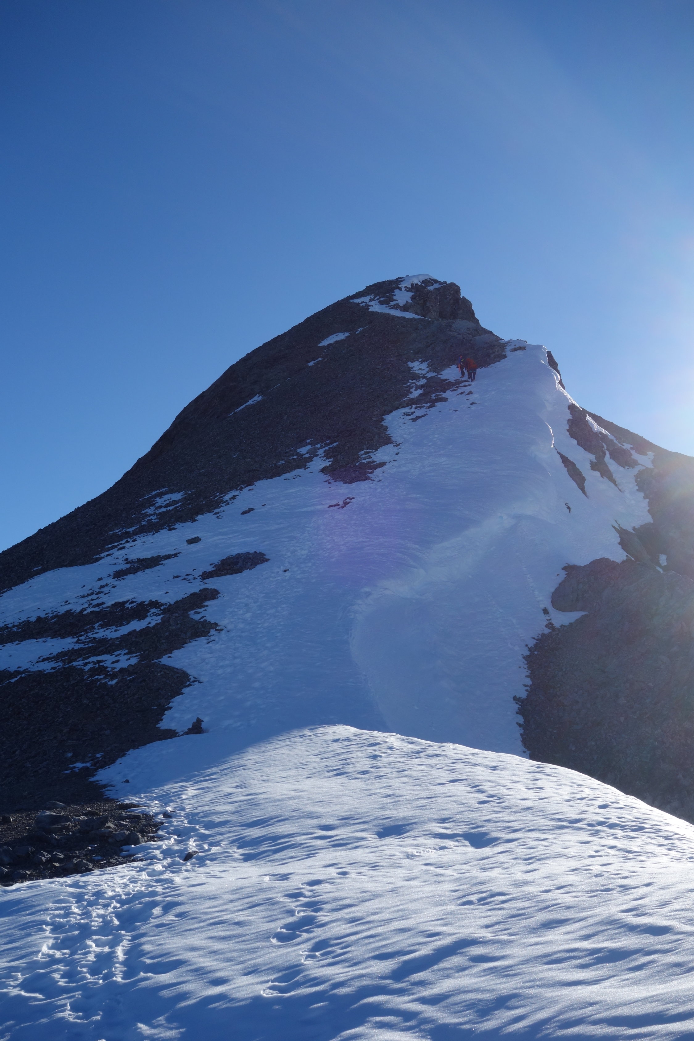 Ab ca. 2500 m lag noch etwas Schnee von letzter Woche. Dieser war aber nicht gefroren und ging problemlos ohne Steigeisen. Auf dem Gletscher gab es eine gute Spur und auch neben der Spur war am frühen Morgen alles gut gefroren. Auf dem Vorgipfel lag nach wie vor Schnee und wir waren froh um unsere Steigeisen, auf dem Rückweg um ca. 11.00 Uhr sind wir dort bereits teils eingebrochen und die Steigeisen waren nicht mehr zwingend notwendig. Der Gipfelaufstieg und die Ketten waren schneefrei.