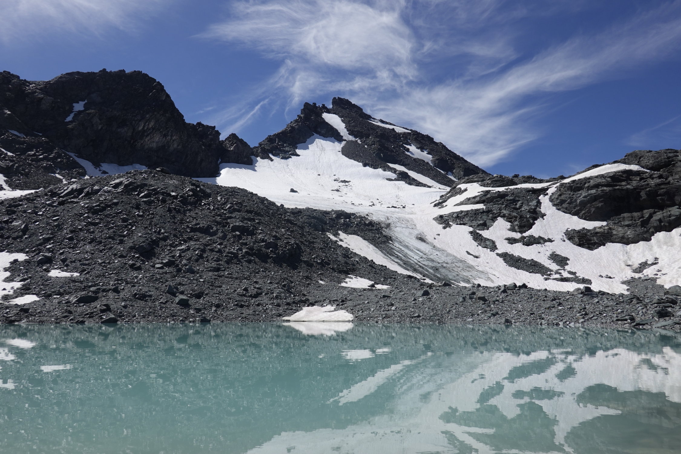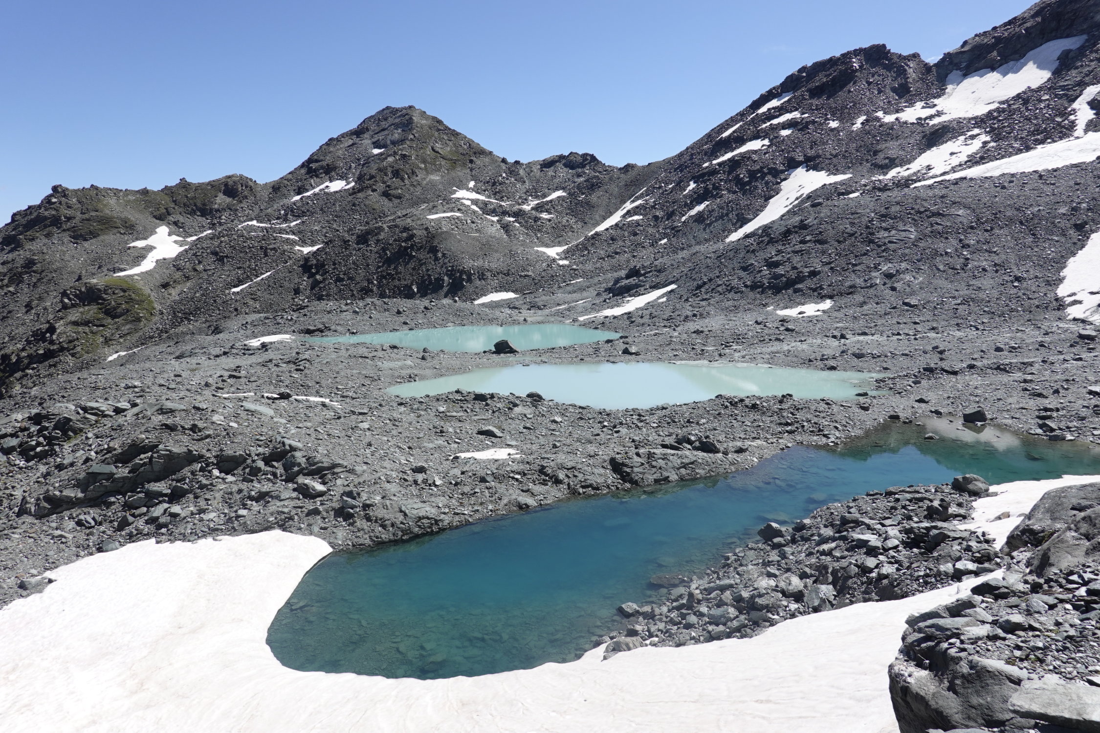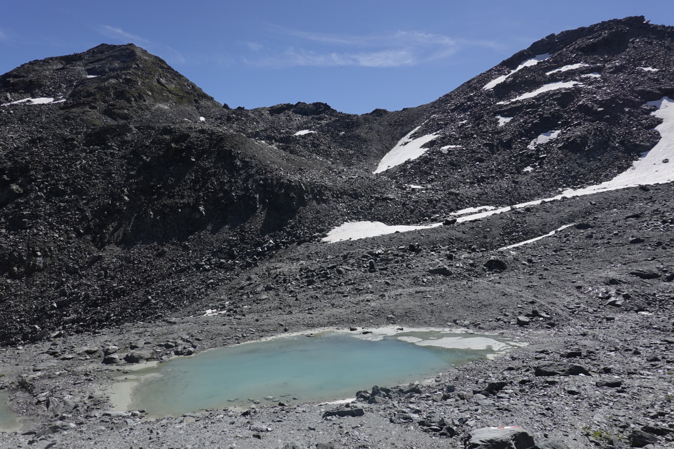 Der Felssporn im Aufstieg von der ersten Seenplatte (ca. 2870 m) auf das Felsplateau westlich davon weist aktuell noch ein kurzes, recht steiles Schneefeld auf. Zusammen mit den etwas ekligen Randklüften bei grobblockigem Schutt ergibt sich auf dem Niveau eines rot-weiss markierten Wanderweges eine etwas knifflige Situation (vgl. "Besonderes/Persönliches").