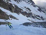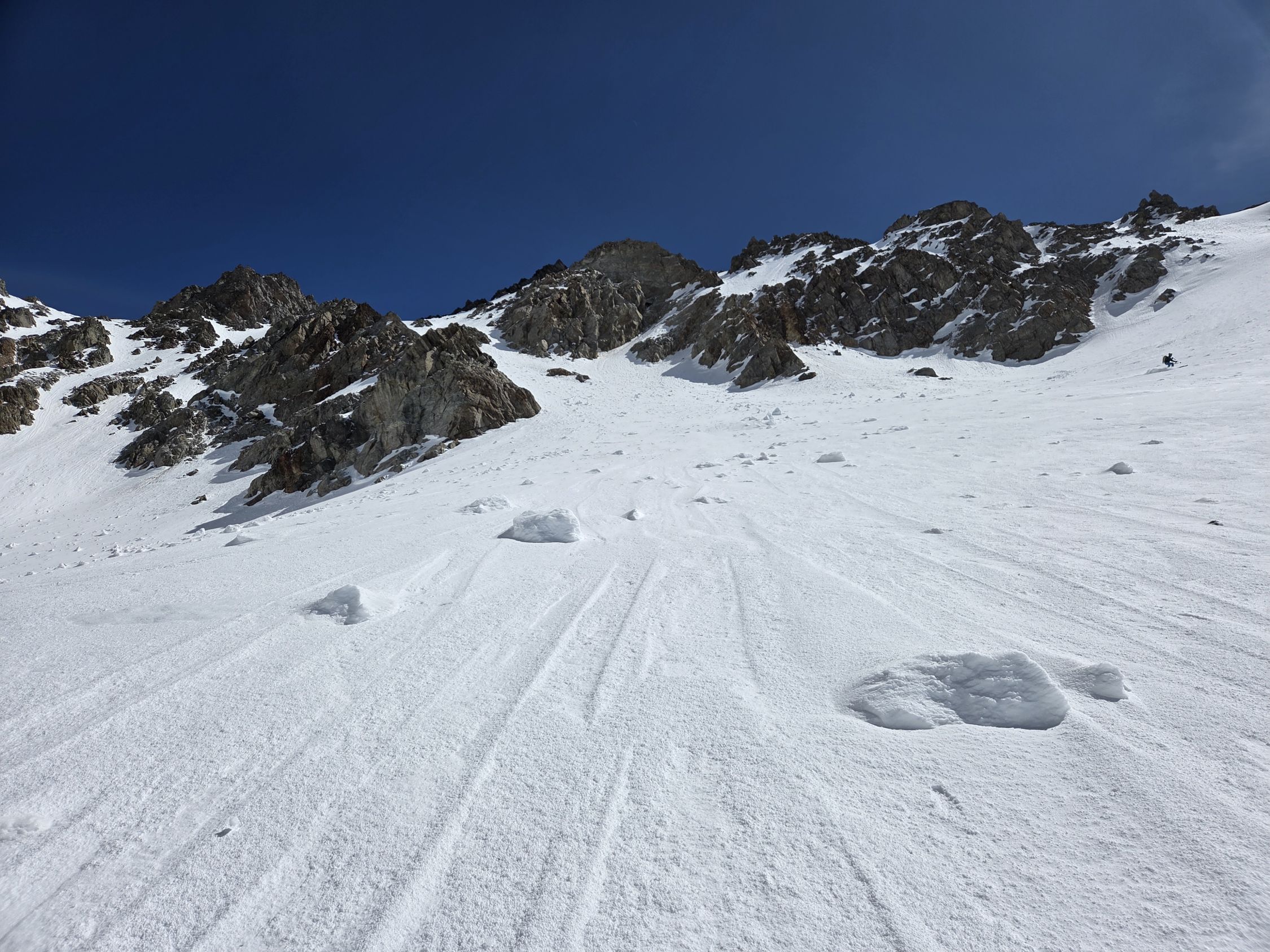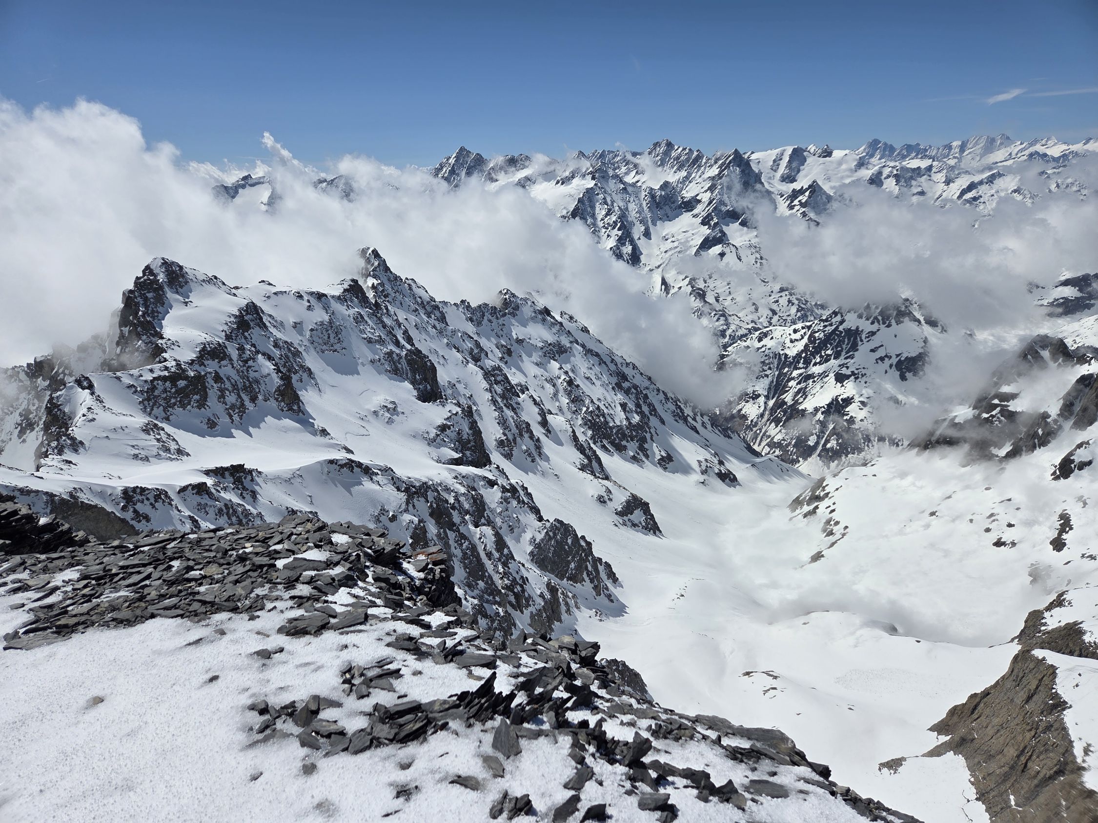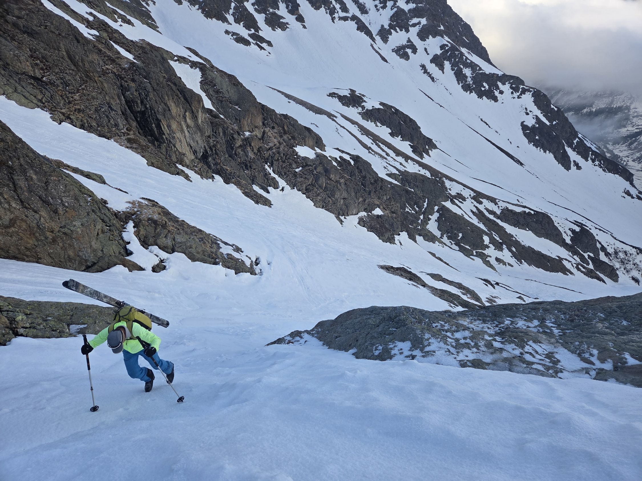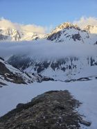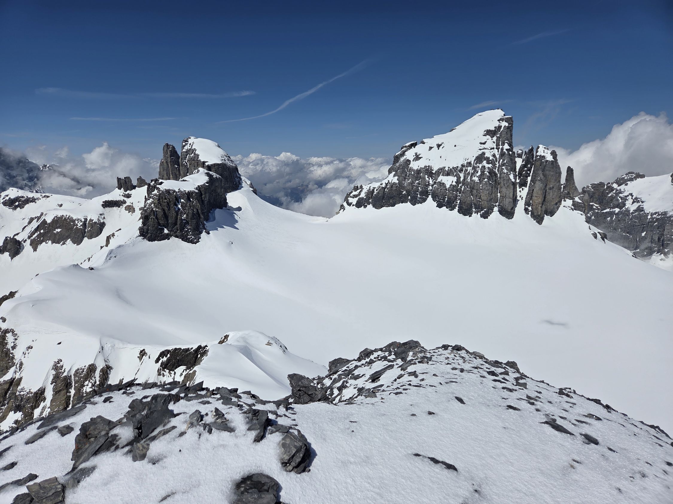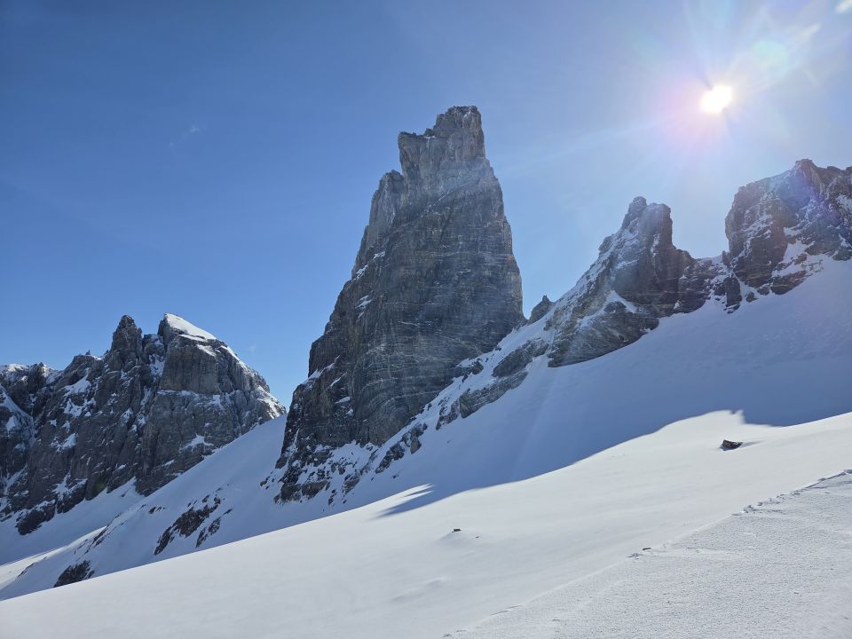 Durchgehend Schnee bis Talkessel Wissgand. Sehr hart, oder kein Schnee. Ab 2400 sind die Schneeverhältnisse traumhaft und der Schnee durchgehend bis zum Chüefadpass. Top Abfahrt und Wiederaufstieg zum Spannortjoch. Versuch Aufstieg zum Gross Spannort. Unterste Felsstufe zu stark vereist. Wir lassen es sein. Weiter über den Glattfirn, der den Namen mehr als verdient. Aufstieg zum Zwächten bestens.