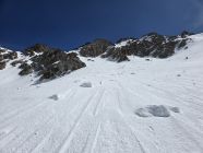 Abfahrt und kurzes Stück mit Steigeisen zum Sattel Richtung Bächenstock. Abfahrt durch das breite Couloir. Sehr gut, abgesehen von ein paar vereisten Lawinenknubels. Anschliessend traumhafter Rossfirn, Rossplangg. Weiter und durchgehend bis knapp vors Brüggli.