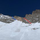 Das südliche Couloir (rot) hat einen alten Strick und zahlreiche improvisierte Abseilstellen. Über dieses sind wir mit 1x50m abgeseilt mit einem zusätzlichen Abakalov-Abseilstand im Eis um über den Bergschrund zu kommen (insgesamt ca. 6x abseilen). Brüchiger Fels und Steinschlag - aus meiner Sicht absolut nicht empfehlenswert. Im Aufstieg in der Früh möglicherweise weit besser möglich (wir waren nach 12h dort). Letzte steile Meter über den Gletscher waren vor letztem Neuschnee wohl schon blank und werden es sehr schnell wieder sein. Couloir hat teils Trittspuren, aber bei Neuschnee nicht offensichtlich.